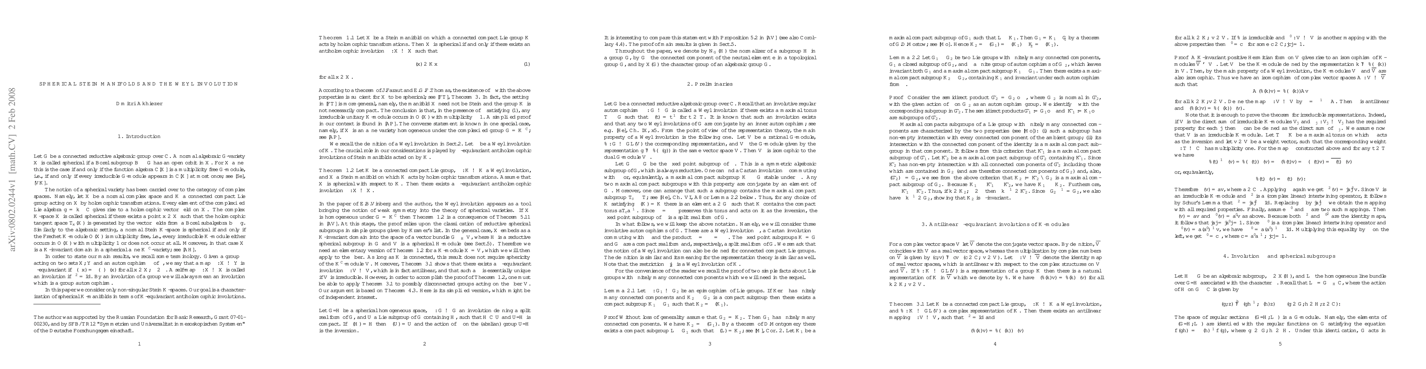 Summary: The paper establishes that a Stein manifold with a connected compact Lie group action is spherical if and only if there exists an antiholomorphic involution that preserves each orbit and can be chosen to be equivariant with respect to a Weyl involution of the group. This result connects the geometry of the manifold to the algebraic structure of the group.