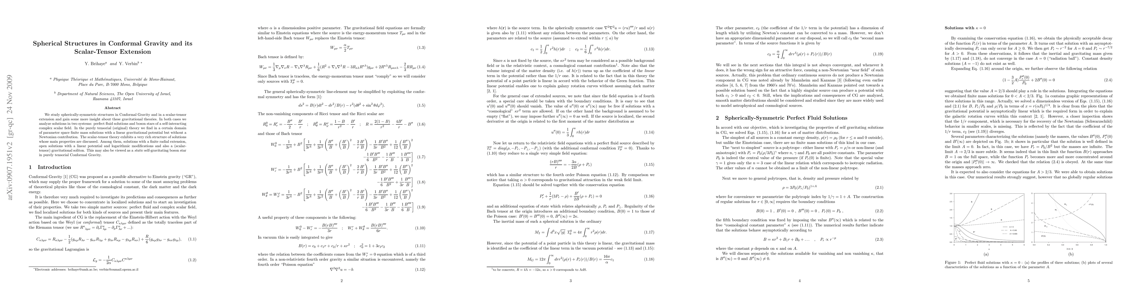 The research investigates spherically symmetric structures in Conformal Gravity (CG) and its scalar-tensor extension, analyzing perfect fluid solutions and boson stars of a self-interacting complex scalar field.
