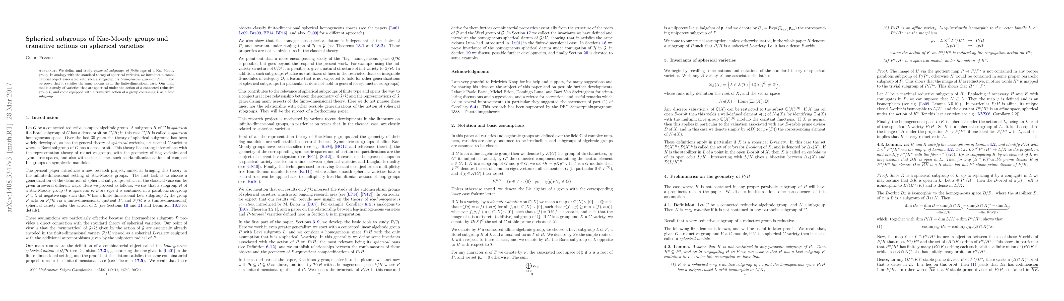 We define and study a class of spherical subgroups of a Kac-Moody group. In analogy with the standard theory of spherical varieties, we introduce a combinatorial object associated with such a subgroup, its homogeneous spherical datum, and we prove that it satisfies the same axioms as in the finite-dimensional case. Our main tool is a study of varieties that are spherical under the action of a connected reductive group L, and come equipped with a transitive action of a group containing L as a Levi subgroup.