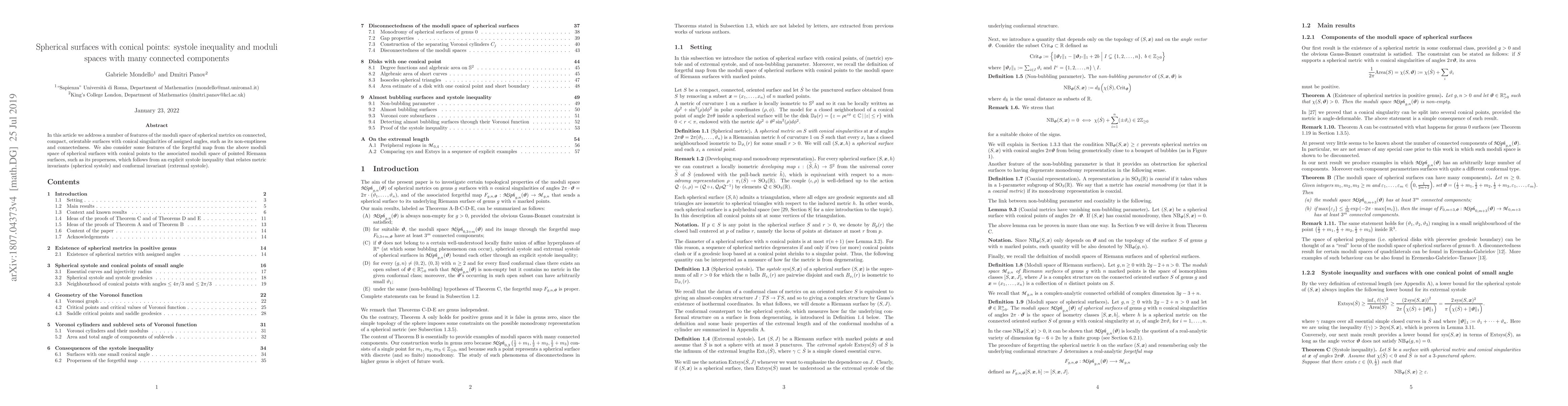 In this article we address a number of features of the moduli space of spherical metrics on connected, compact, orientable surfaces with conical singularities of assigned angles, such as its non-emptiness and connectedness. We also consider some features of the forgetful map from the above moduli space of spherical surfaces with conical points to the associated moduli space of pointed Riemann surfaces, such as its properness, which follows from an explicit systole inequality that relates metric invariants (spherical systole) and conformal invariant (extremal systole).