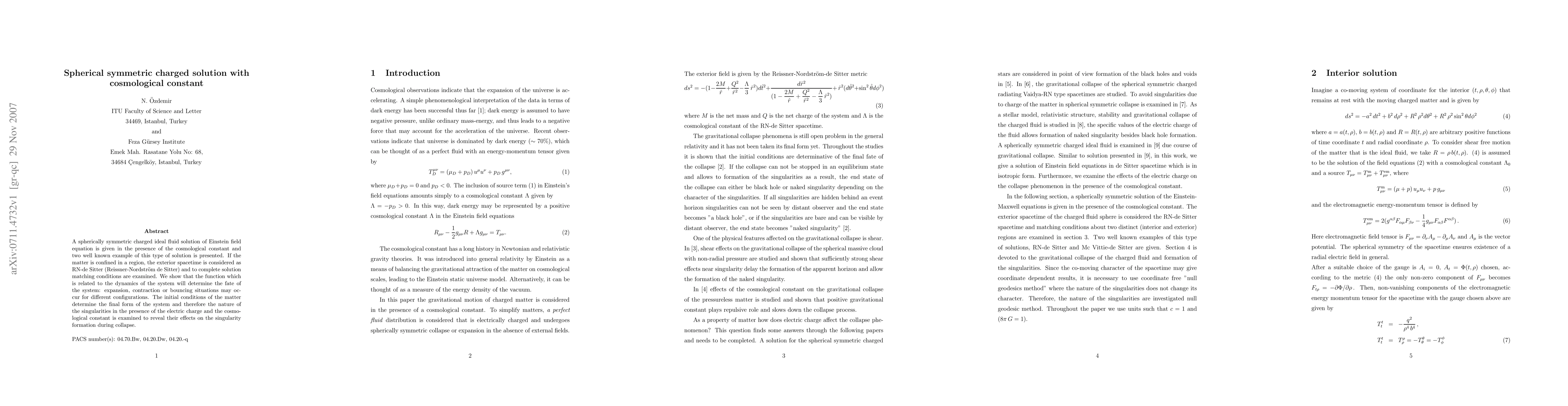This research paper examines spherically symmetric charged solutions in Einstein field equations with a cosmological constant, finding that initial conditions determine the system's fate: expansion, contraction, or bouncing scenarios. The study reveals how electric charge and cosmological constant affect singularity formation during collapse.