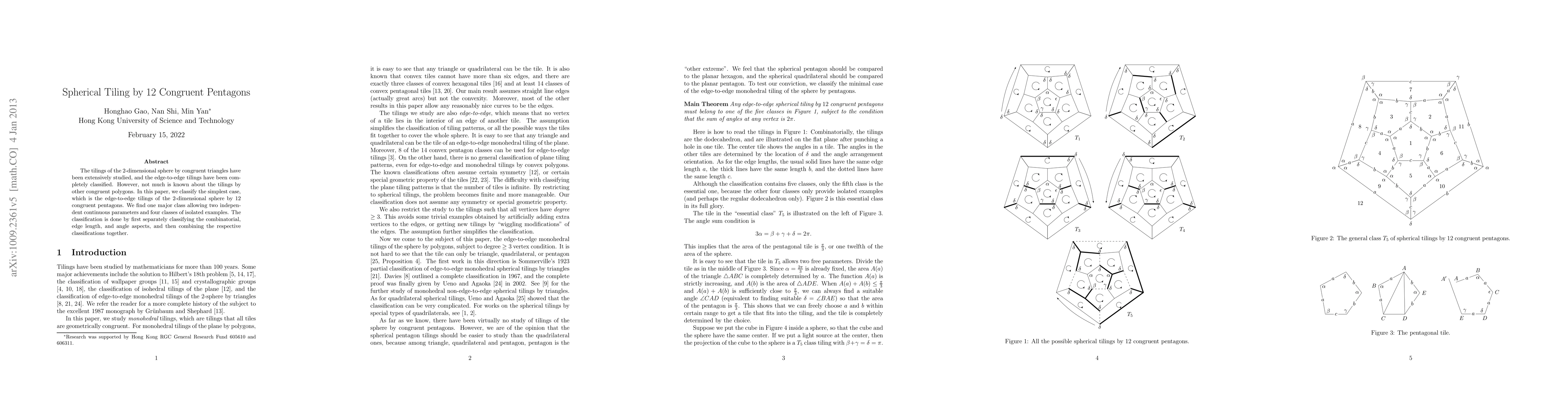 The tilings of the 2-dimensional sphere by congruent triangles have been extensively studied, and the edge-to-edge tilings have been completely classified. However, not much is known about the tilings by other congruent polygons. In this paper, we classify the simplest case, which is the edge-to-edge tilings of the 2-dimensional sphere by 12 congruent pentagons. We find one major class allowing two independent continuous parameters and four classes of isolated examples. The classification is done by first separately classifying the combinatorial, edge length, and angle aspects, and then combining the respective classifications together.