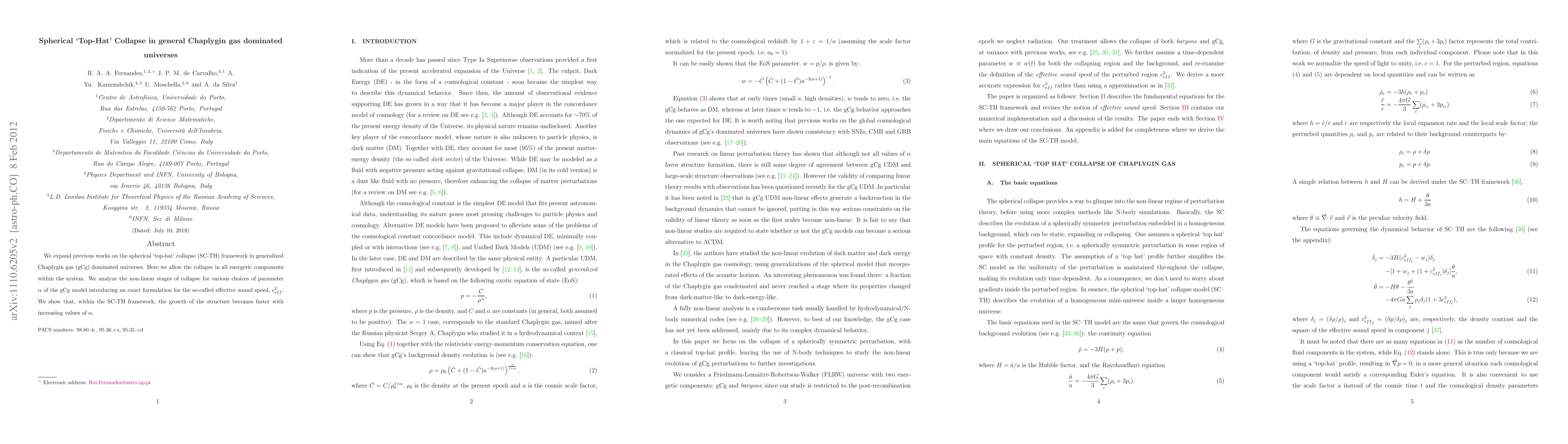 We expand previous works on the spherical `top-hat' collapse (SC-TH) framework in generalized Chaplygin gas (gCg) dominated universes. Here we allow the collapse in all energetic components within the system. We analyze the non-linear stages of collapse for various choices of parameter \alpha of the gCg model introducing an exact formulation for the so-called effective sound speed, $c_{eff}^2$. We show that, within the SC-TH framework, the growth of the structure becomes faster with increasing values of \alpha.