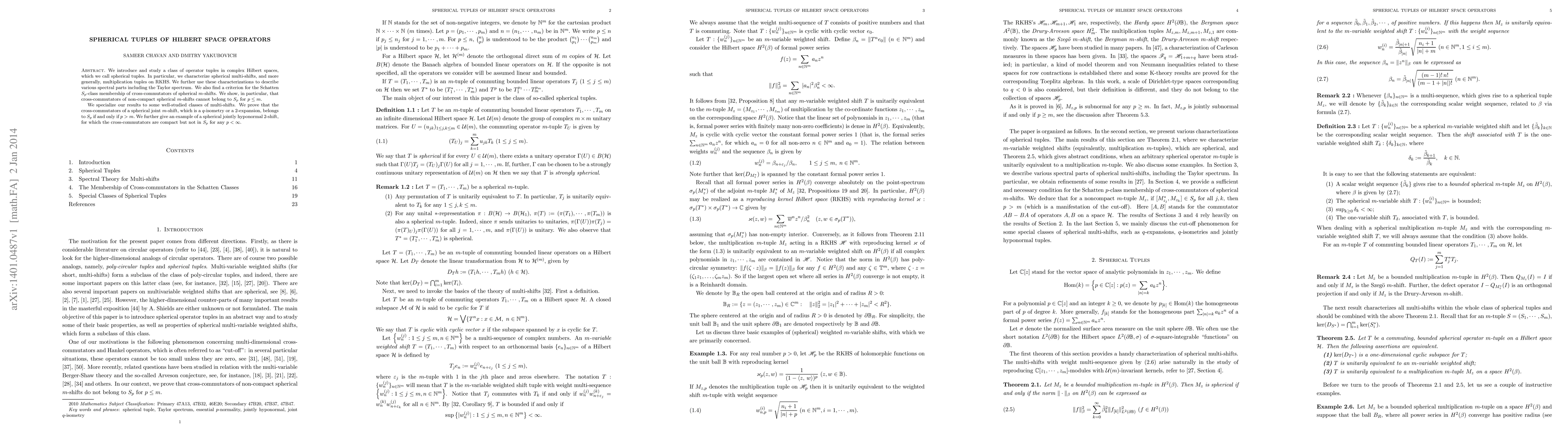 This paper introduces spherical tuples of Hilbert space operators, characterizes spherical multi-shifts, and explores their spectral properties, including the Taylor spectrum. It also provides criteria for the Schatten $S_p$-class membership of cross-commutators of spherical $m$-shifts, particularly showing that non-compact ones cannot belong to $S_p$ for $p \le m$.