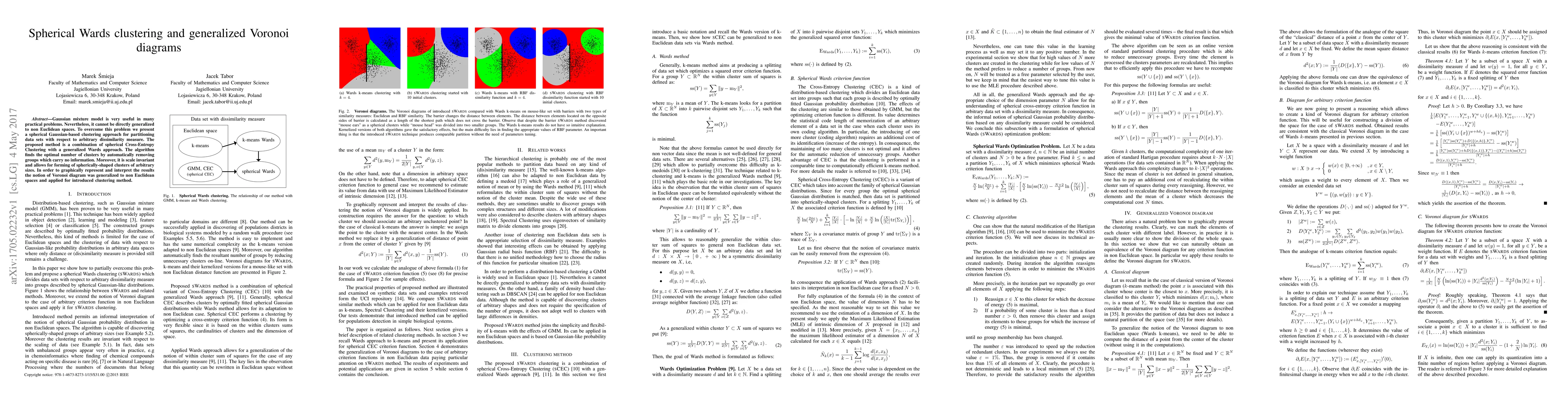 Gaussian mixture model is very useful in many practical problems. Nevertheless, it cannot be directly generalized to non Euclidean spaces. To overcome this problem we present a spherical Gaussian-based clustering approach for partitioning data sets with respect to arbitrary dissimilarity measure. The proposed method is a combination of spherical Cross-Entropy Clustering with a generalized Wards approach. The algorithm finds the optimal number of clusters by automatically removing groups which carry no information. Moreover, it is scale invariant and allows for forming of spherically-shaped clusters of arbitrary sizes. In order to graphically represent and interpret the results the notion of Voronoi diagram was generalized to non Euclidean spaces and applied for introduced clustering method.