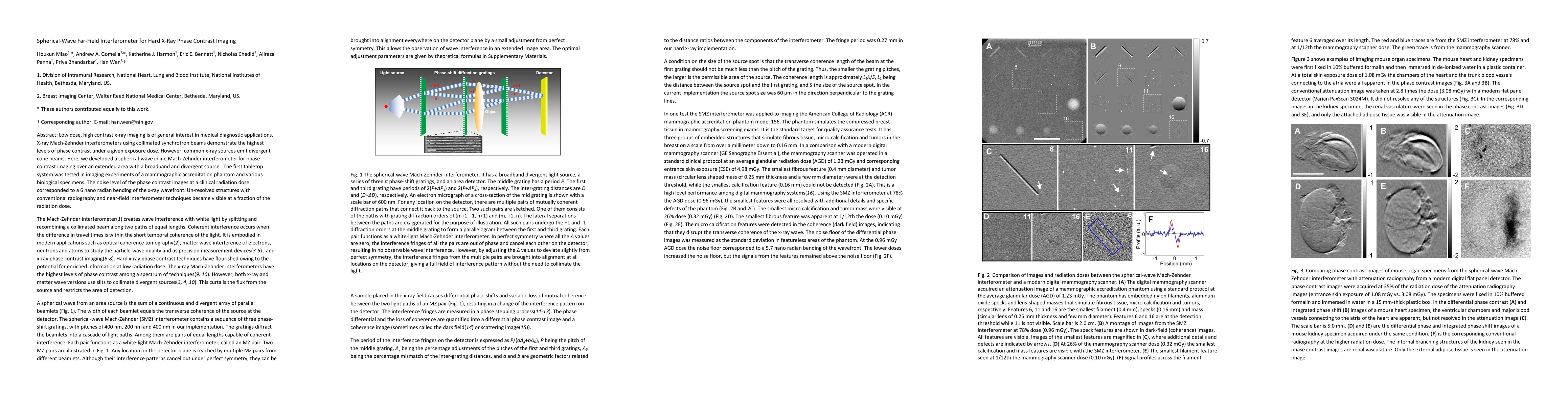 This paper presents a novel spherical-wave inline Mach-Zehnder interferometer for high-contrast, low-dose hard X-ray phase contrast imaging using divergent sources. The tabletop system successfully demonstrated imaging of a mammographic accreditation phantom and biological specimens, achieving visibility of un-resolved structures at a fraction of conventional radiation dose.