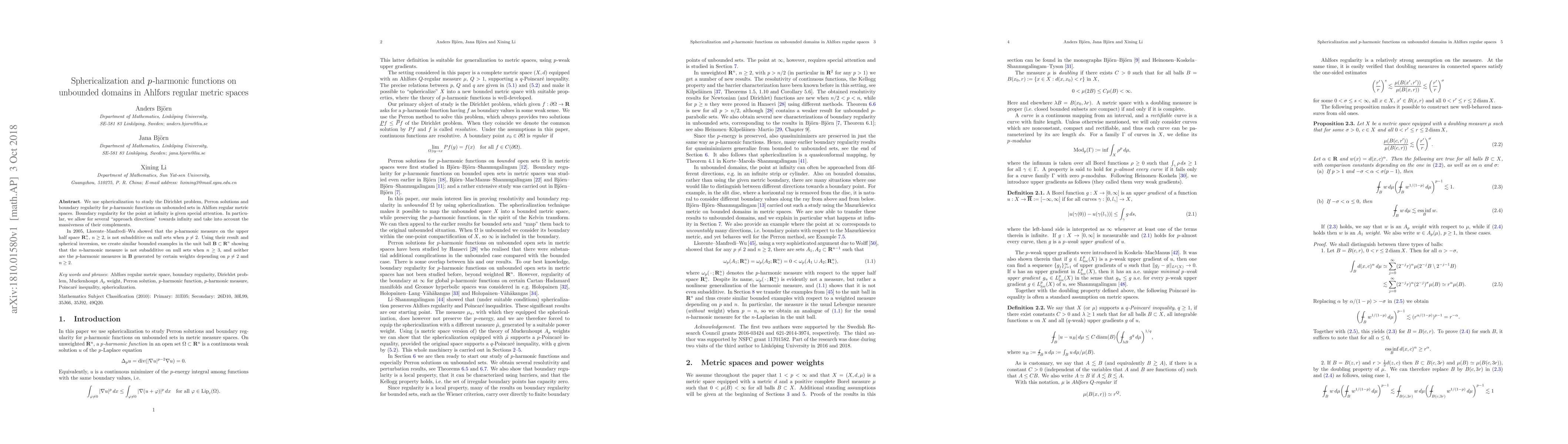 We use sphericalization to study the Dirichlet problem, Perron solutions and boundary regularity for p-harmonic functions on unbounded sets in Ahlfors regular metric spaces. Boundary regularity for the point at infinity is given special attention. In particular, we allow for several "approach directions" towards infinity and take into account the massiveness of their complements. In 2005, Llorente-Manfredi-Wu showed that the p-harmonic measure on the upper half space $R^n_+, n \ge 2$, is not subadditive on null sets when $p \neq 2$. Using their result and spherical inversion, we create similar bounded examples in the unit ball $B \subset R^n$ showing that the n-harmonic measure is not subadditive on null sets when $n \ge 3$, and neither are the p-harmonic measures in $B$ generated by certain weights depending on $p\neq 2$ and $n \ge 2$.