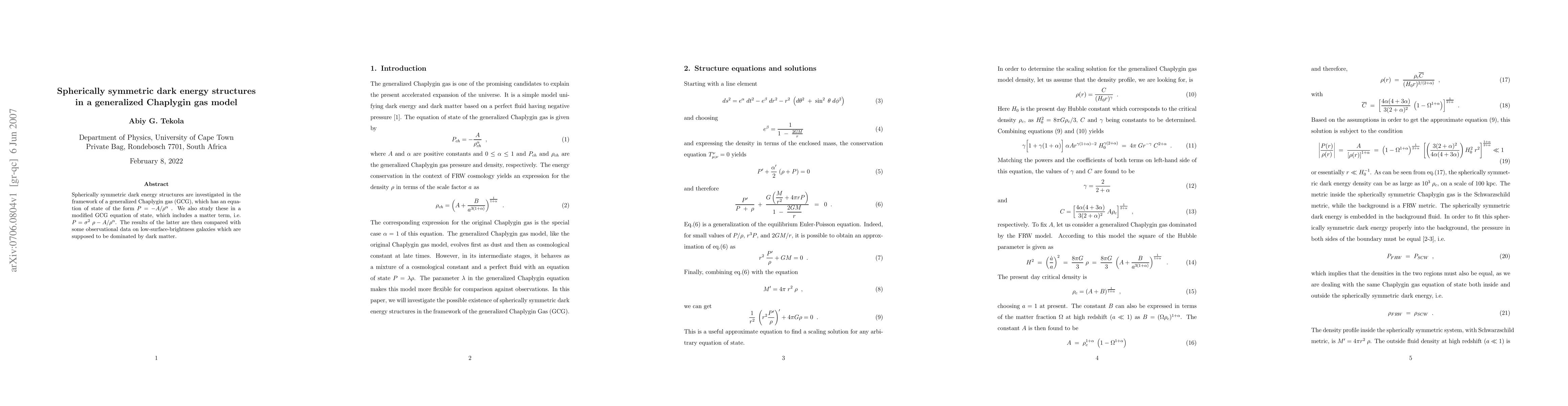 Spherically symmetric dark energy structures are investigated in the framework of a generalized Chaplygin gas (GCG), which has an equation of state of the form $P = - A/\rho^{\alpha}} $. We also study these in a modified GCG equation of state, which includes a matter term, i.e. $P = \sigma^{2} \rho - A/\rho^{\alpha}$. The results of the latter are then compared with some observational data on low-surface-brightness galaxies which are supposed to be dominated by dark matter.