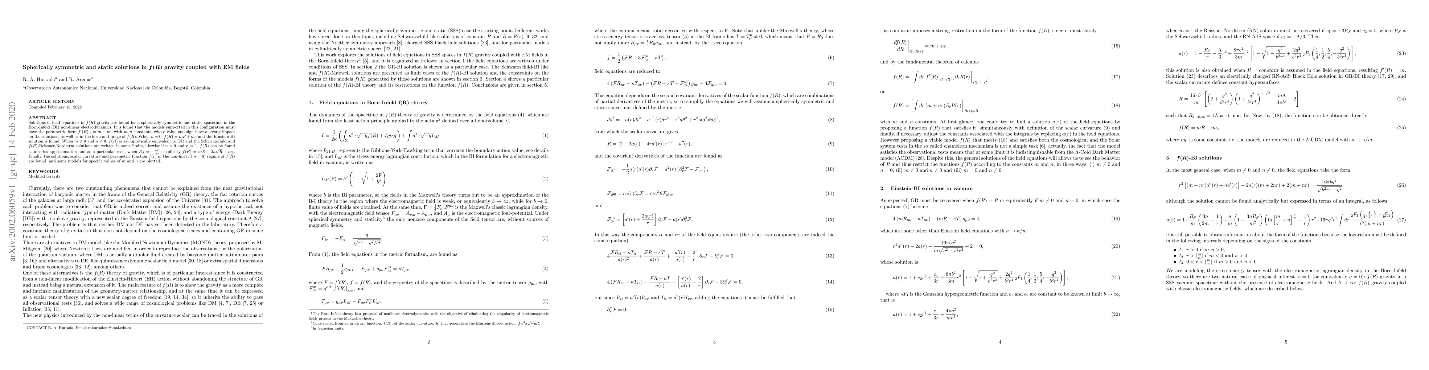 Solutions of field equations in $f(R)$ gravity are found for a spherically symmetric and static spacetime in the Born-Infeld (BI) non-linear electrodynamics. It is found that the models supported in this configuration must have the parametric form $f'(R)|_{r}=m+n r$, with $m,n$ constants, whose value and sign have a strong impact on the solutions, as well as in the form and range of $f(R)$. When $n=0$, $f(R)=m R+m_0$ and the Einstein-BI solution is found. When $m\neq 0$ and $n\neq0$, $f(R)$ is asymptotically equivalent to GR and the Schwarzschild and $f(R)$-Reissner-Nordstr\"om solutions are written in some limits, likewise if $n>0$ and $r\gg1$, $f(R)$ can be found as a series approximation and as a particular case, when $R_S=-\frac{m^2}{3n}$, explicitly $f(R)=m R+2n\sqrt{R}+m_0$. Finally, the solutions, scalar curvature and parametric function $f(r)$ in the non-linear ($m=0$) regime of $f(R)$ are found, and some models for specific values of $m$ and $n$ are plotted.