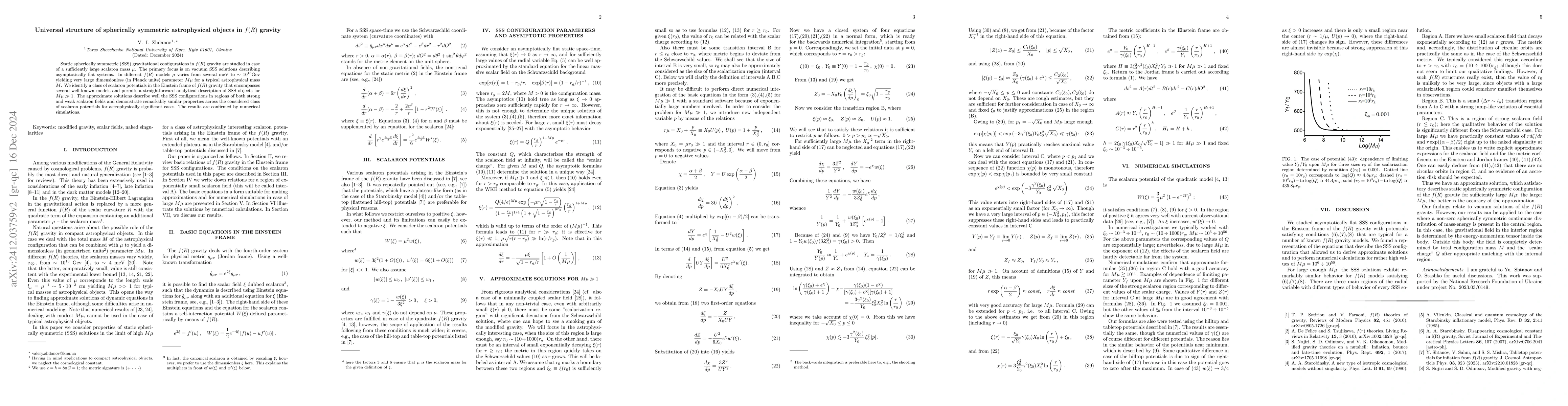 Static spherically symmetric (SSS) configurations in the Einstein's frame of $f(R)$ gravity are studied in the limit of large scalaron mass $\mu$. The main attention is paid to vacuum solutions describing asymptotically flat astrophysical systems. We note that astrophysical objects usually deal with a very large dimensionless parameter $M\mu$, where $M$ is the total mass, which allows making analytical approximations. Approximate solutions are obtained that describe well the SSS systems in the regions of strong and weak scalaron fields for astrophysically interesting cases; this is confirmed by numerical simulations. The solutions show a remarkably similar properties for a class of scalaron potentials in the limit of high $\mu$.