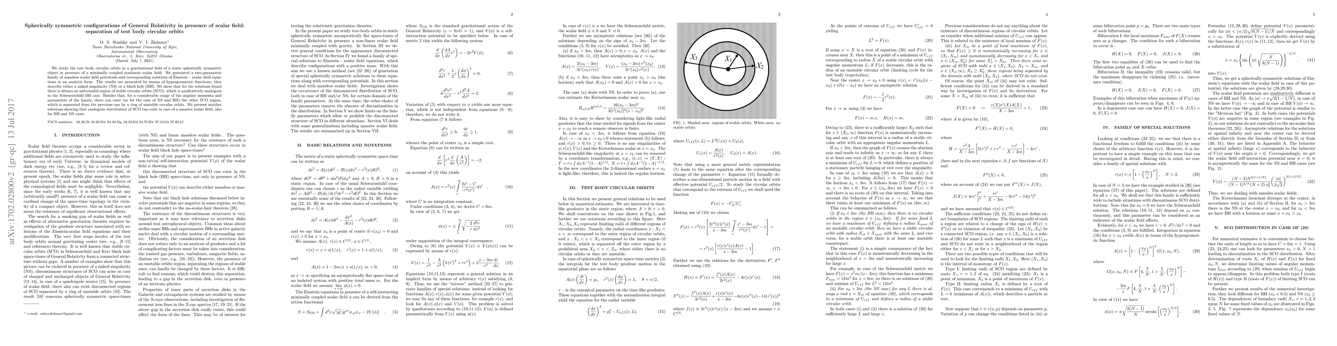 We study test-body orbits in the gravitational field of a static spherically symmetric object in presence of a minimally coupled nonlinear scalar field. We generated a two-parametric family of scalar field potentials, which allow finding solutions of Einstein's equations in an analytic form. The results are presented by means of hypergeometric functions; they describe either a naked singularity (NS) or a black hole (BH). Our numerical investigation shows that in both cases the stable circular orbits can form separated (non-connected) regions around the configuration. We found existence conditions for such separated regions and present examples for some family parameters in case of NS and BH. The results may be of interest for testing models of the dynamical dark energy.