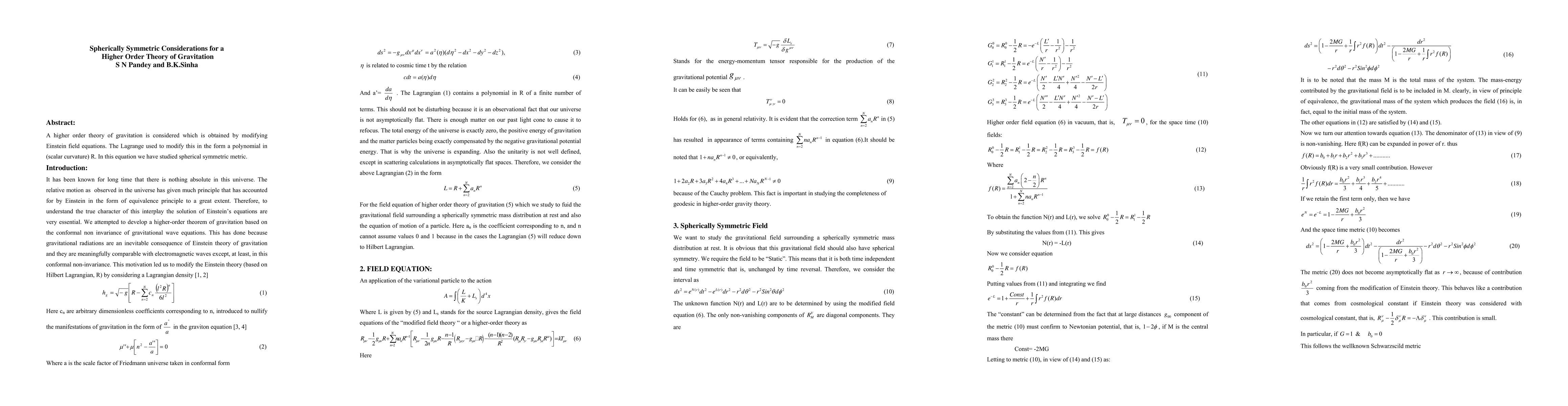 A higher order theory of gravitation is considered which is obtained by modifying Einstein field equations. The Lagrange used to modify this in the form a polynomial in (scalar curvature) R. In this equation we have studied spherical symmetric metric.