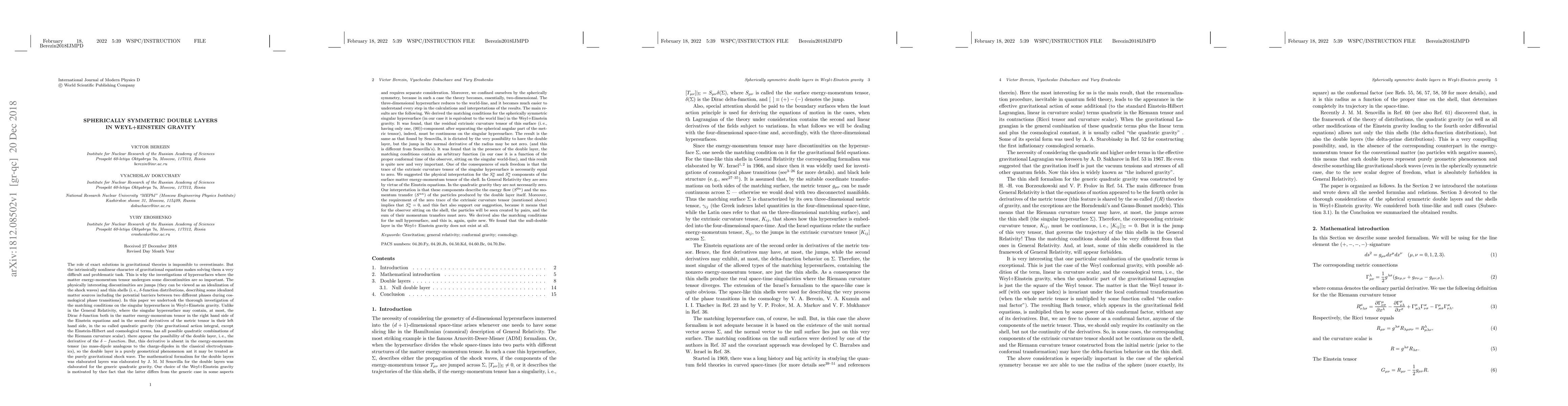 Researchers in Weyl+Einstein gravity found that spherically symmetric double layers have matching conditions with a continuous extrinsic curvature tensor, which implies a zero trace for the surface matter energy-momentum tensor components describing particle momentum transfers.