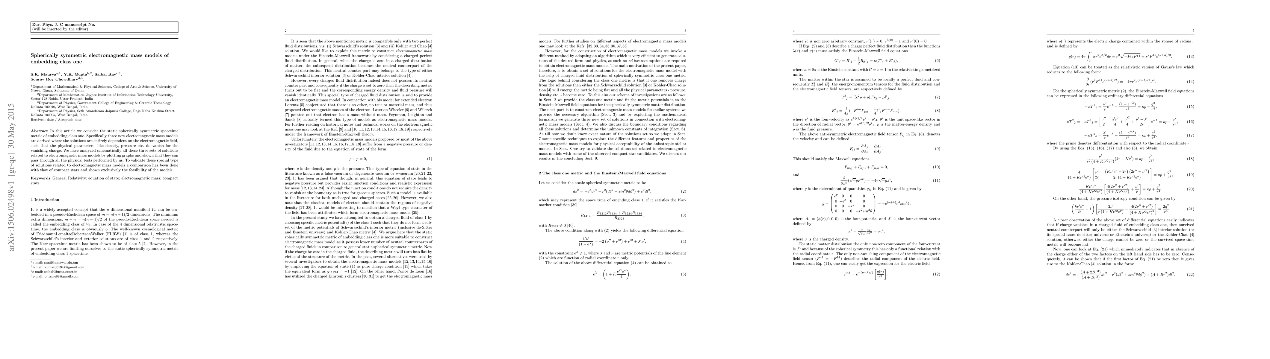 This paper derives three new spherically symmetric electromagnetic mass models for embedding class one, demonstrating that physical parameters vanish with charge. The models pass physical tests and show feasibility when compared to compact stars.