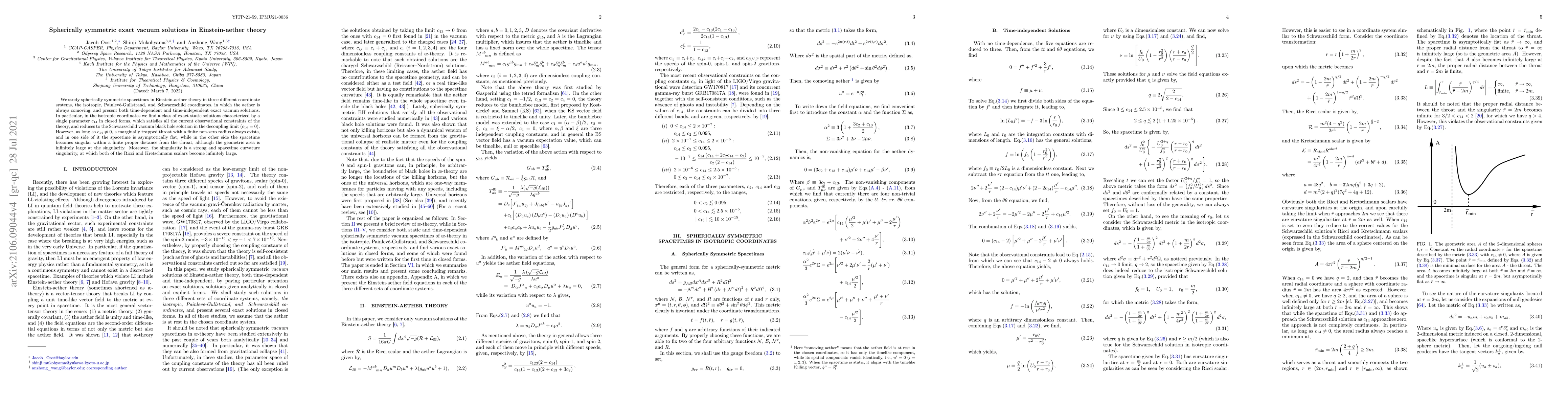 We study spherically symmetric spacetimes in Einstein-aether theory in three different coordinate systems, the isotropic, Painlev\`e-Gullstrand, and Schwarzschild coordinates, in which the aether is always comoving, and present both time-dependent and time-independent exact vacuum solutions. In particular, in the isotropic coordinates we find a class of exact static solutions characterized by a single parameter $c_{14}$ in closed forms, which satisfies all the current observational constraints of the theory, and reduces to the Schwarzschild vacuum black hole solution in the decoupling limit ($c_{14} = 0$). However, as long as $c_{14} \not= 0$, a marginally trapped throat with a finite non-zero radius always exists, and in one side of it the spacetime is asymptotically flat, while in the other side the spacetime becomes singular within a finite proper distance from the throat, although the geometric area is infinitely large at the singularity. Moreover, the singularity is a strong and spacetime curvature singularity, at which both of the Ricci and Kretschmann scalars become infinitely large.