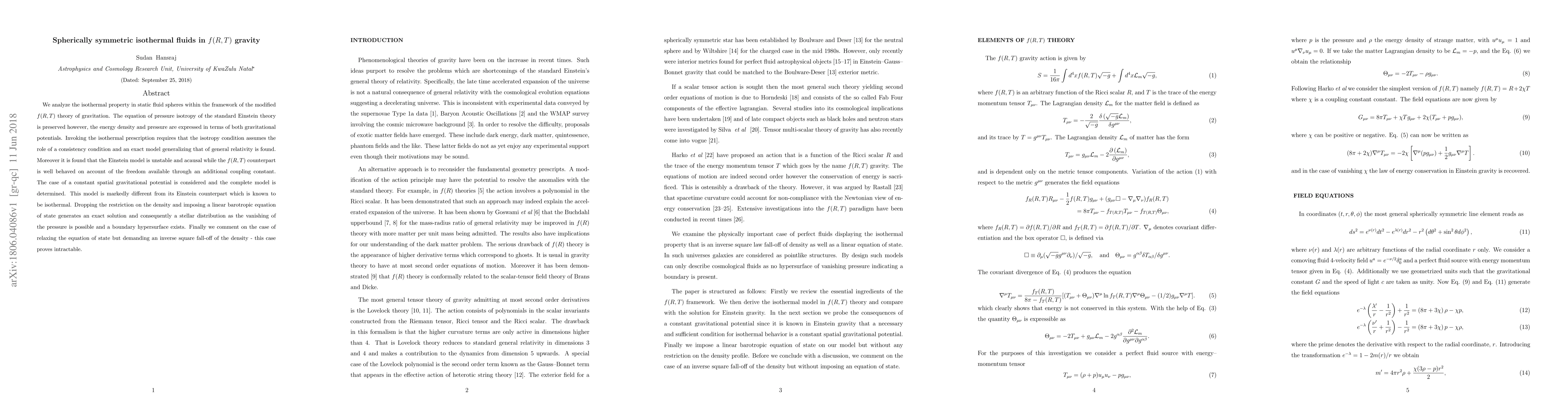 We analyze the isothermal property in static fluid spheres within the framework of the modified $f(R, T)$ theory of gravitation. The equation of pressure isotropy of the standard Einstein theory is preserved however, the energy density and pressure are expressed in terms of both gravitational potentials. Invoking the isothermal prescription requires that the isotropy condition assumes the role of a consistency condition and an exact model generalizing that of general relativity is found. Moreover it is found that the Einstein model is unstable and acausal while the $f(R, T)$ counterpart is well behaved on account of the freedom available through an additional coupling constant. The case of a constant spatial gravitational potential is considered and the complete model is determined. This model is markedly different from its Einstein counterpart which is known to be isothermal. Dropping the restriction on the density and imposing a linear barotropic equation of state generates an exact solution and consequently a stellar distribution as the vanishing of the pressure is possible and a boundary hypersurface exists. Finally we comment on the case of relaxing the equation of state but demanding an inverse square fall-off of the density - this case proves intractable.