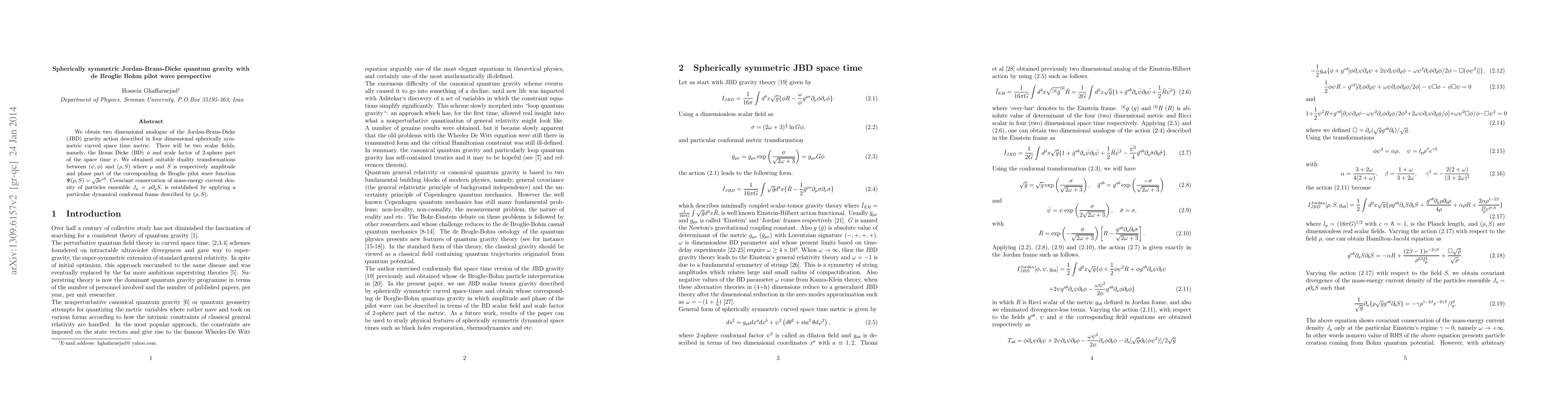 We obtain two dimensional analogue of the Jordan-Brans-Dicke (JBD) gravity action described in four dimensional spherically symmetric curved space time metric. There will be two scalar fields, namely, the Brans Dicke (BD) $\phi$ and scale factor of 2-sphere part of the space time $\psi.$ We obtained suitable duality transformations between $(\psi,\phi)$ and $(\rho,S)$ where $\rho$ and $S$ is respectively amplitude and phase part of the corresponding de Broglie pilot wave function $\Psi(\rho,S)=\sqrt{\rho}e^{iS}.$ Covariant conservation of mass-energy current density of particles ensemble $J_a=\rho\partial_aS,$ is established by applying a particular dynamical conformal frame described by $(\rho,S).$