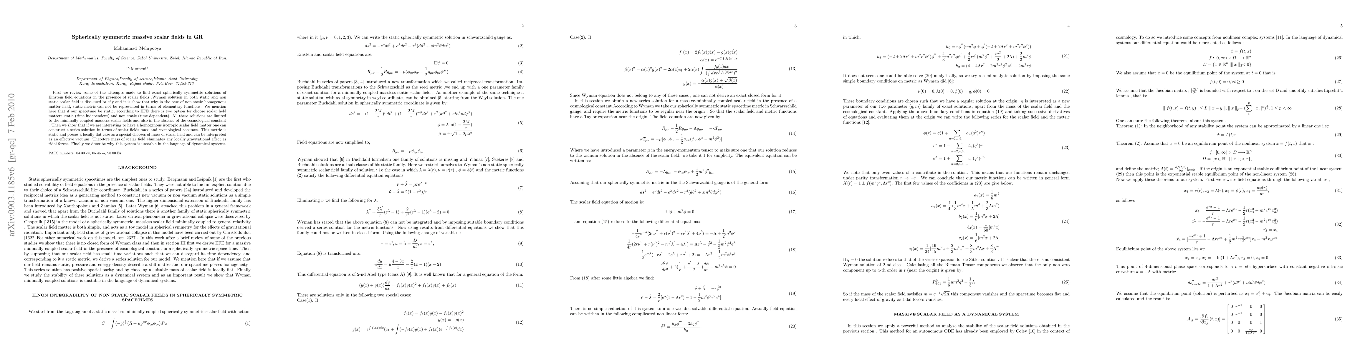 First we review some of the attempts made to find exact spherically symmetric solutions of Einstein field equations in the presence of scalar fields .Wyman solution in both static and non static scalar field is discussed briefly and it is show that why in the case of non static homogenous matter field, static metric can not be represented in terms of elementary functions. We mention here that if our spacetime be static, according to EFE there is two option for choose scalar field matter: static (time independent) and non static (time dependent). All these solutions are limited to the minimally coupled massless scalar fields and also in the absence of the cosmological constant . Then we show that if we are interesting to have a homogenous isotropic scalar field matter one can construct a series solution in terms of scalar field's mass and cosmological constant. This metric is static and posses a locally flat case as a special chooses of mass of scalar field and can be interpreted as an effective vacuum. Therefore mass of scalar field eliminates any locally gravitational effect as tidal forces. Finally we describe why this system is unstable in the language of dynamical systems.