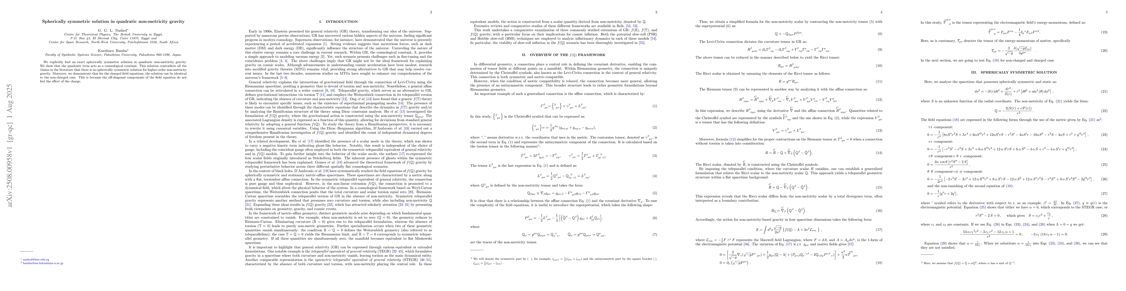 We explicitly find an exact spherically symmetric solution in quadratic non-metricity gravity. We show that the quadratic term acts as a cosmological constant. This solution contradicts all the claims in the literature that there is no spherically symmetric solution for higher-order non-metricity gravity. Moreover, we demonstrate that for the charged field equations, the solution can be identical to the non-charged case. This is because the off-diagonal components of the field equation do not feel the effect of the charge.