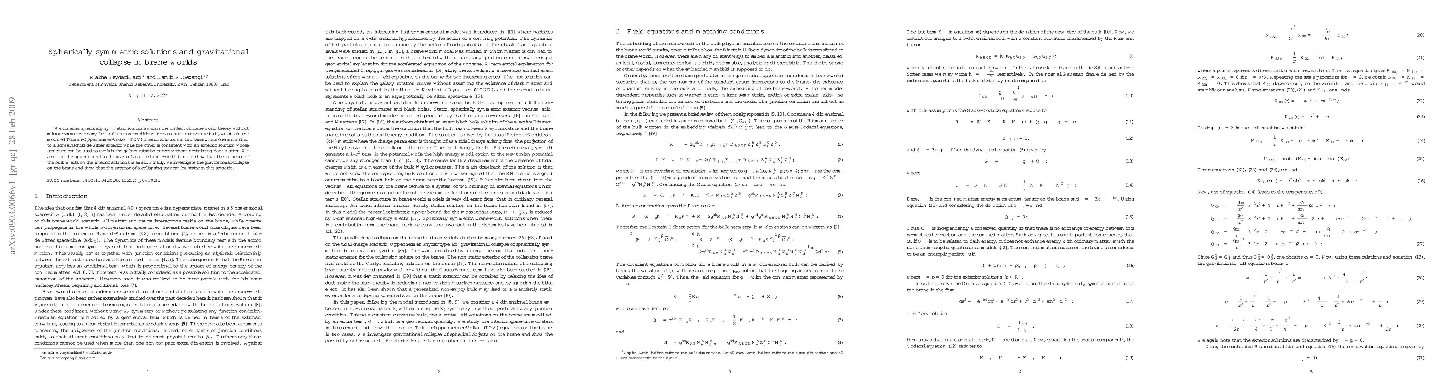 This paper explores spherically symmetric solutions in brane-world theory without junction conditions, deriving modified Tolman-Oppenheimer-Volkoff equations for constant curvature bulks. It finds solutions matching to Schwarzschild-de Sitter or galaxy rotation curve exteriors, sets an upper mass bound for static brane-world stars, and examines gravitational collapse, revealing a static exterior for collapsing stars.