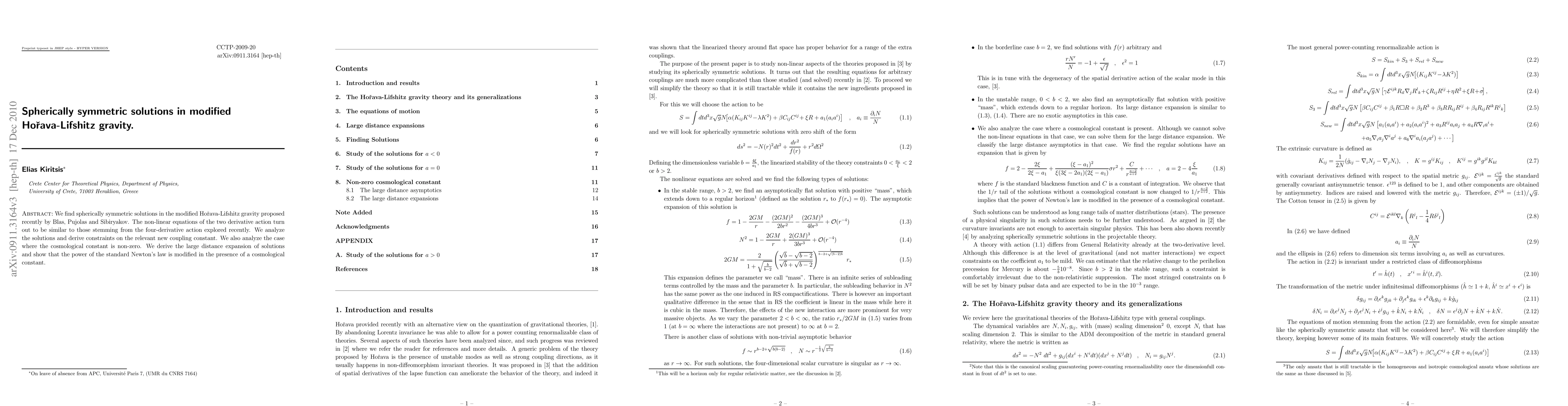This paper finds spherically symmetric solutions in modified Horava-Lifshitz gravity, showing that the non-linear equations resemble those from a four-derivative action. The study derives constraints on a new coupling constant and examines the implications of a non-zero cosmological constant, revealing a modified power in Newton's law at large distances.