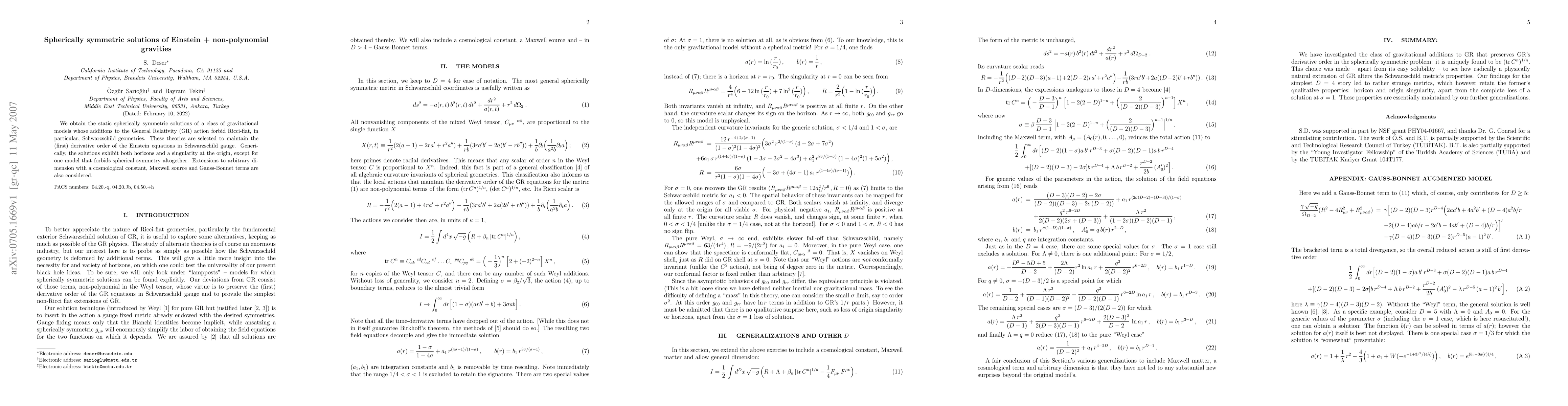 This research derives static spherically symmetric solutions in altered gravity models, excluding Schwarzschild geometry. It explores these solutions with extra dimensions, cosmological constant, Maxwell field, and Gauss-Bonnet terms, revealing horizons and a central singularity, except for one model that disallows spherical symmetry.