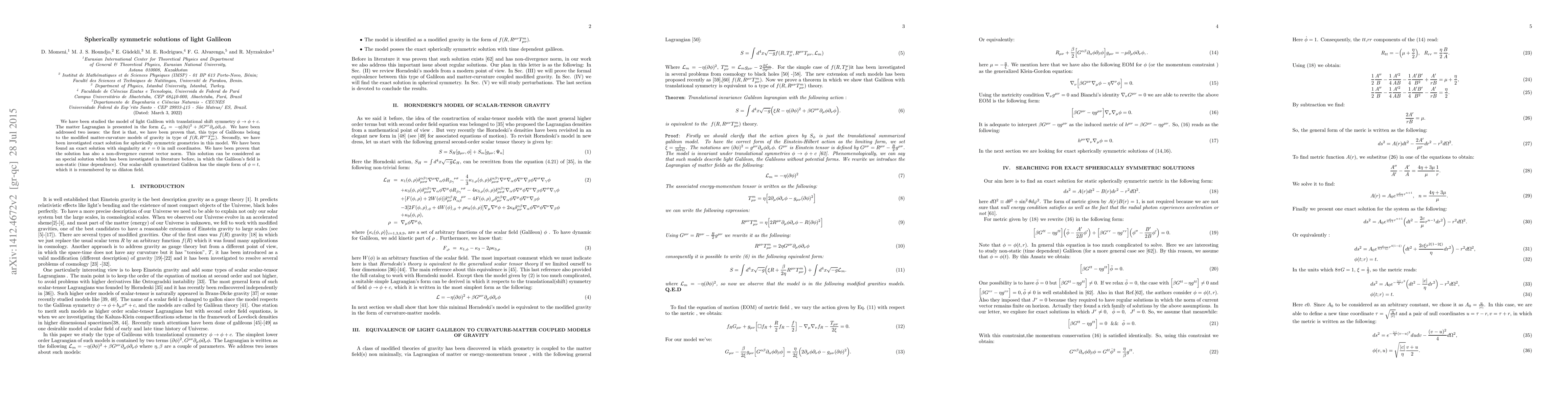 This paper investigates spherically symmetric solutions of the light Galileon model with translational shift symmetry. The authors demonstrate that these Galileons fit into modified gravity models and present an exact solution with a singularity at $r=0$ in null coordinates, featuring a non-divergence current vector norm.