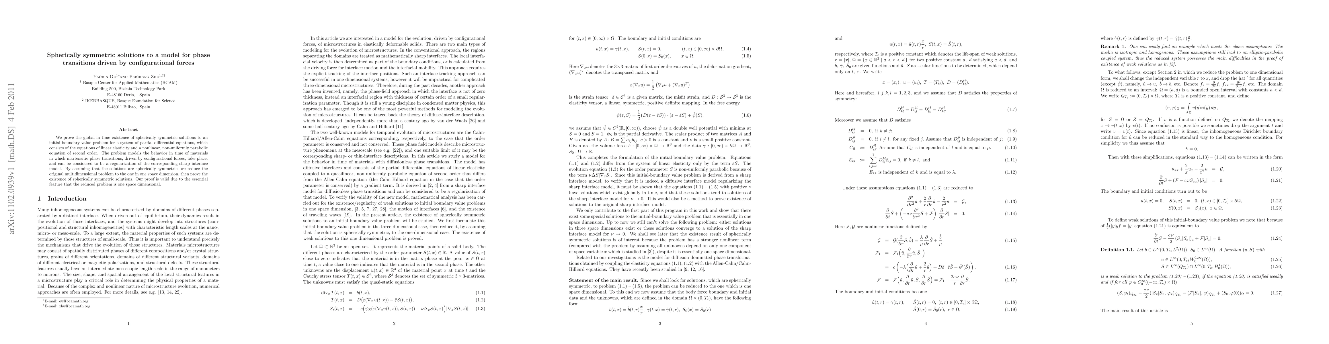 We prove the global in time existence of spherically symmetric solutions to an initial-boundary value problem for a system of partial differential equations, which consists of the equations of linear elasticity and a nonlinear, non-uniformly parabolic equation of second order. The problem models the behavior in time of materials in which martensitic phase transitions, driven by configurational forces, take place, and can be considered to be a regularization of the corresponding sharp interface model. By assuming that the solutions are spherically symmetric, we reduce the original multidimensional problem to the one in one space dimension, then prove the existence of spherically symmetric solutions. Our proof is valid due to the essential feature that the reduced problem is one space dimensional.