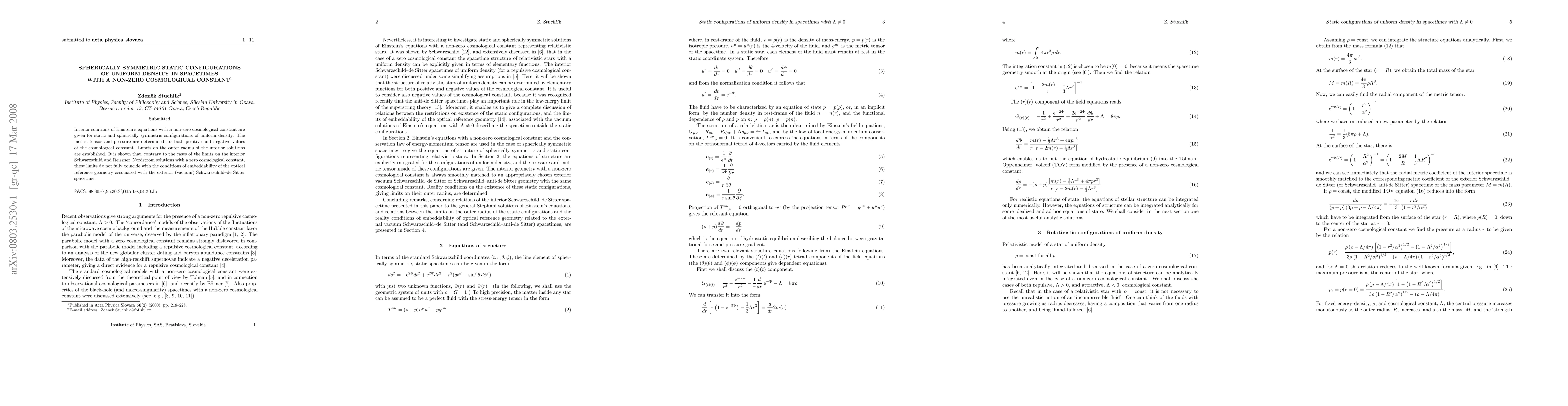 Interior solutions of Einstein's equations with a non-zero cosmological constant are given for static and spherically symmetric configurations of uniform density. The metric tensor and pressure are determined for both positive and negative values of the cosmological constant. Limits on the outer radius of the interior solutions are established. It is shown that, contrary to the cases of the limits on the interior Schwarzschild and Reissner--Nordstr\"om solutions with a zero cosmological constant, these limits do not fully coincide with the conditions of embeddability of the optical reference geometry associated with the exterior (vacuum) Schwarzschild--de Sitter spacetime.
