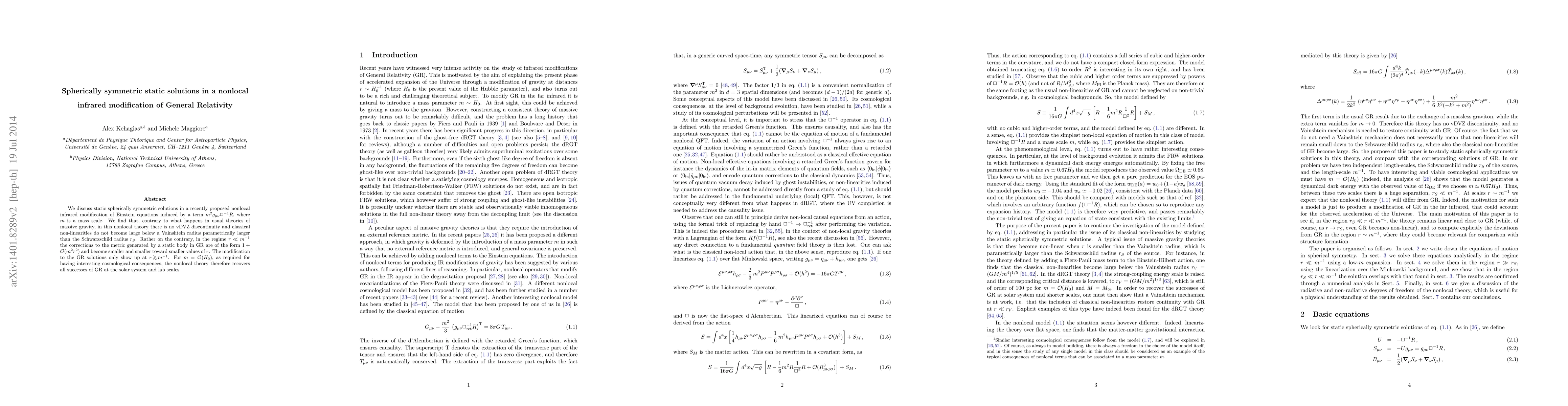 This paper explores static spherically symmetric solutions in a non-local infrared modification of General Relativity, finding that it avoids the vDVZ discontinuity and maintains GR's successes at small scales, with modifications only appearing at larger distances.