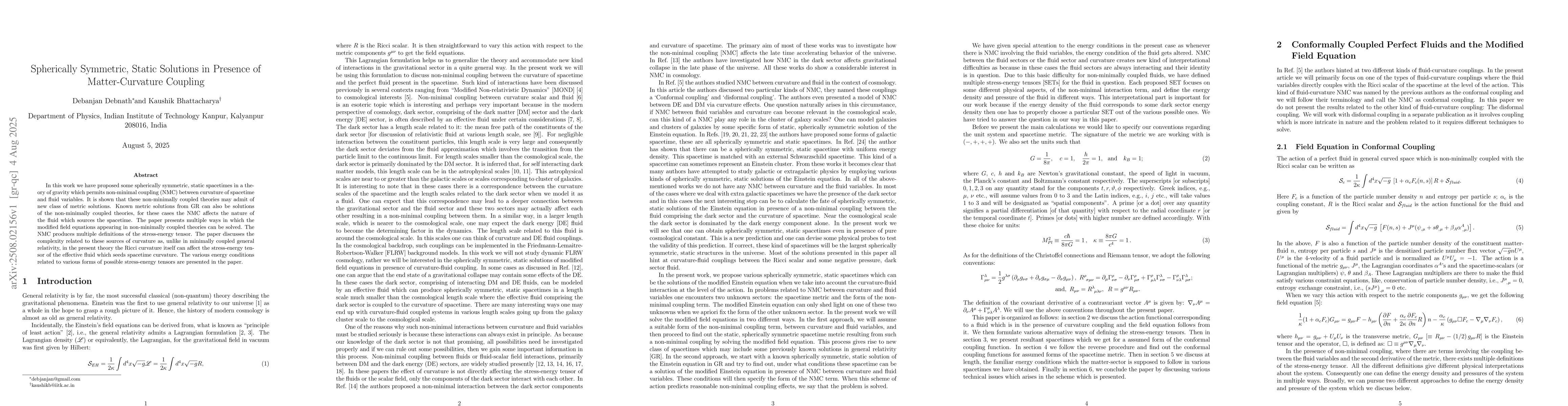 In this work we have proposed some spherically symmetric, static spacetimes in a theory of gravity which permits non-minimal coupling (NMC) between curvature of spacetime and fluid variables. It is shown that these non-minimally coupled theories may admit of new class of metric solutions. Known metric solutions from GR can also be solutions of the non-minimally coupled theories, for these cases the NMC affects the nature of the fluid which sources the spacetime. The paper presents multiple ways in which the modified field equations appearing in non-minimally coupled theories can be solved. The NMC produces multiple definitions of the stress-energy tensor. The paper discusses the complexity related to these sources of curvature as, unlike in minimally coupled general relativity, in the present theory the Ricci curvature itself can affect the stress-energy tensor of the effective fluid which seeds spacetime curvature. The various energy conditions related to various forms of possible stress-energy tensors are presented in the paper.