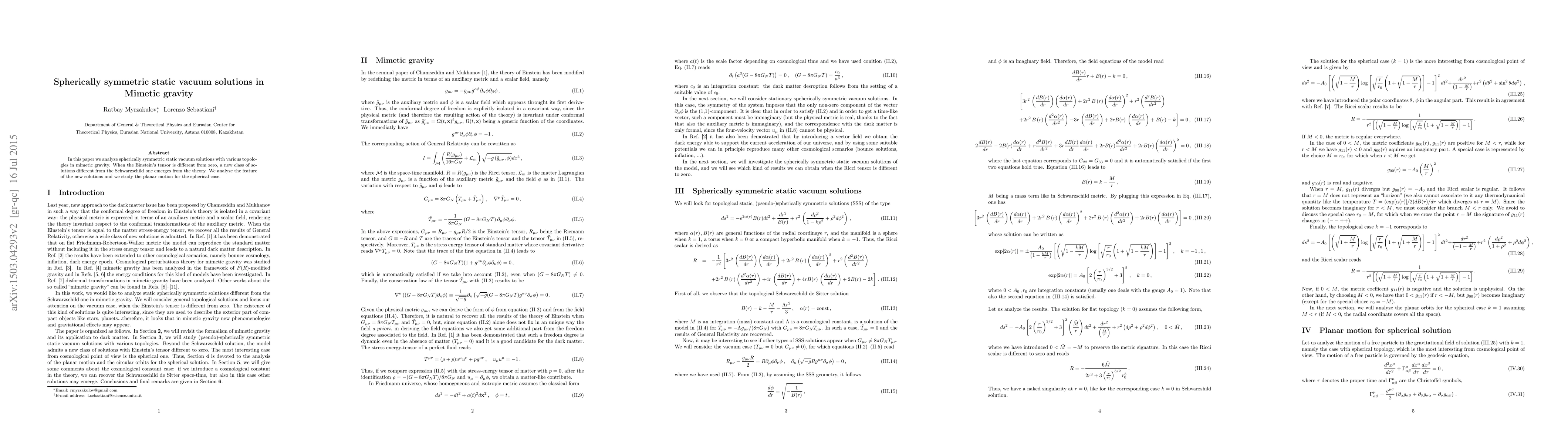 In this paper we analyze spherically symmetric static vacuum solutions with various topologies in mimetic gravity. When the Einstein's tensor is different from zero, a new class of solutions different from the Schwarzschild one emerges from the theory. We analyze the feature of the new solutions and we study the planar motion for the spherical case.