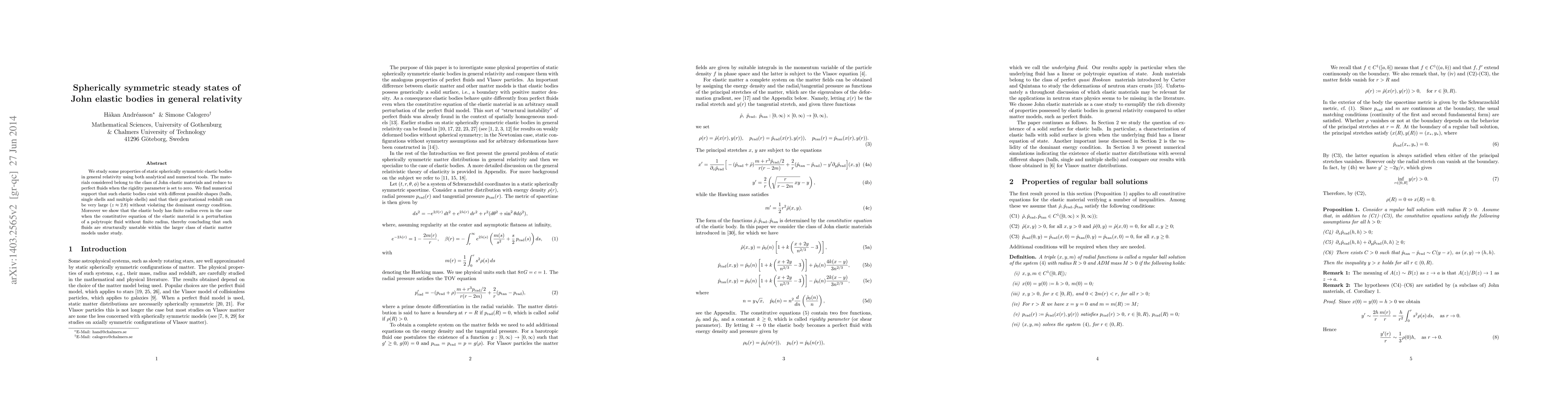 This paper investigates static spherically symmetric elastic bodies in general relativity, focusing on John elastic materials. It finds numerical evidence that such elastic bodies can exist in various shapes and exhibit significant gravitational redshift, while remaining structurally stable compared to polytropic fluids.
