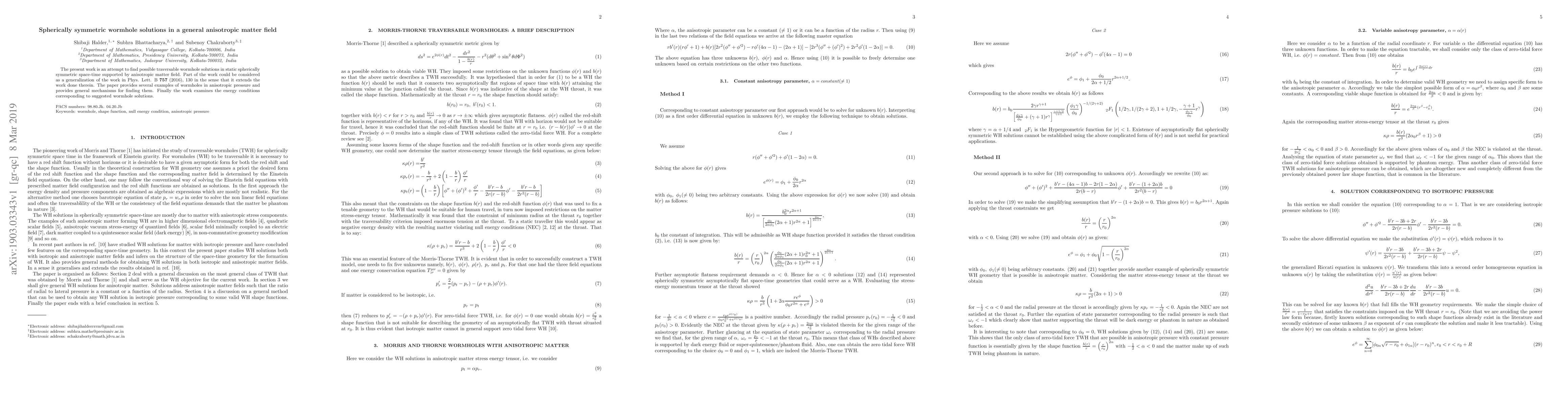 This paper explores traversable wormhole solutions in static spherically symmetric space-time supported by anisotropic matter fields, providing examples and general mechanisms for their existence, and examines the associated energy conditions. The study generalizes previous work and offers new insights into wormholes under anisotropic pressure.