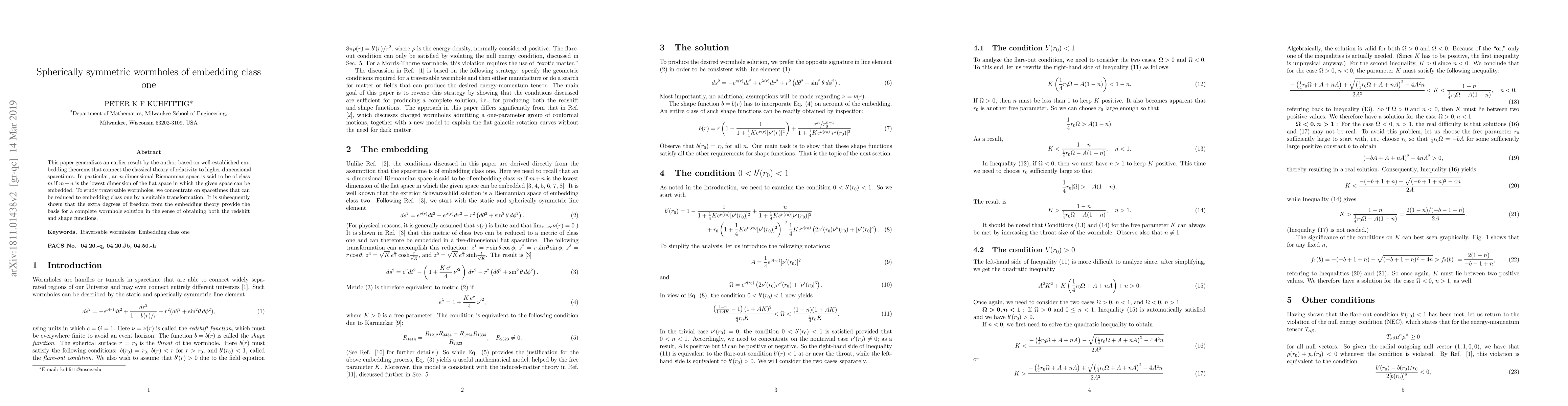 A new method was developed for reducing a spherically symmetric metric of embedding class two to one, allowing for the derivation of a complete wormhole solution.