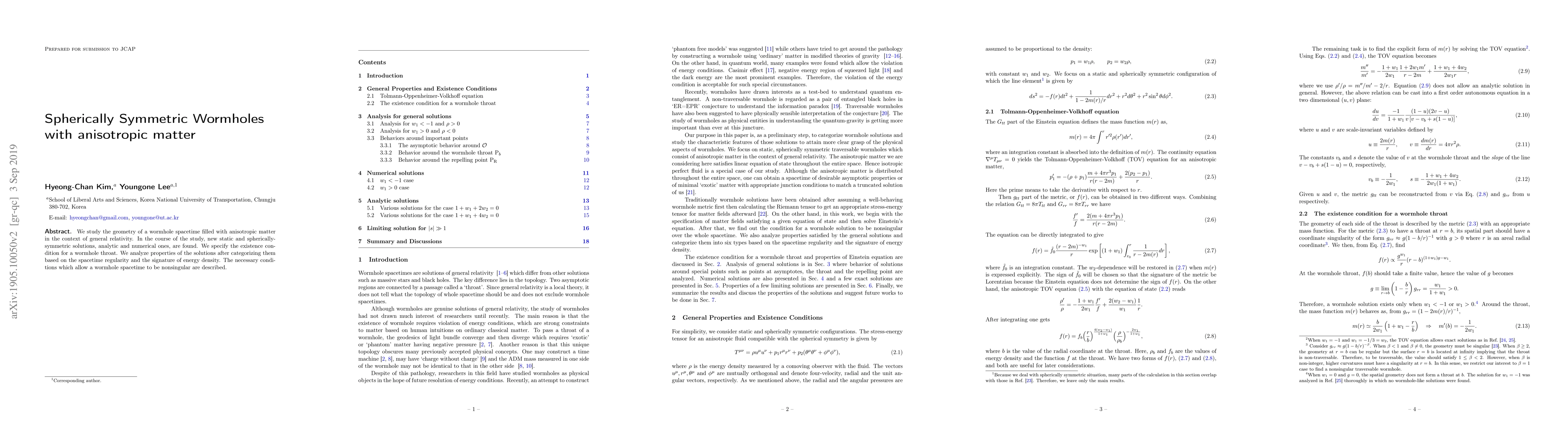 We study the geometry of a wormhole spacetime filled with anisotropic matter in the context of general relativity. In the course of the study, new static and spherically symmetric solutions, analytic and numerical ones, are found. We specify the existence condition for a wormhole throat. We analyze properties of the solutions after categorizing them based on the spacetime regularity and the signature of energy density. The necessary conditions which allow a wormhole spacetime to be nonsingular are described.