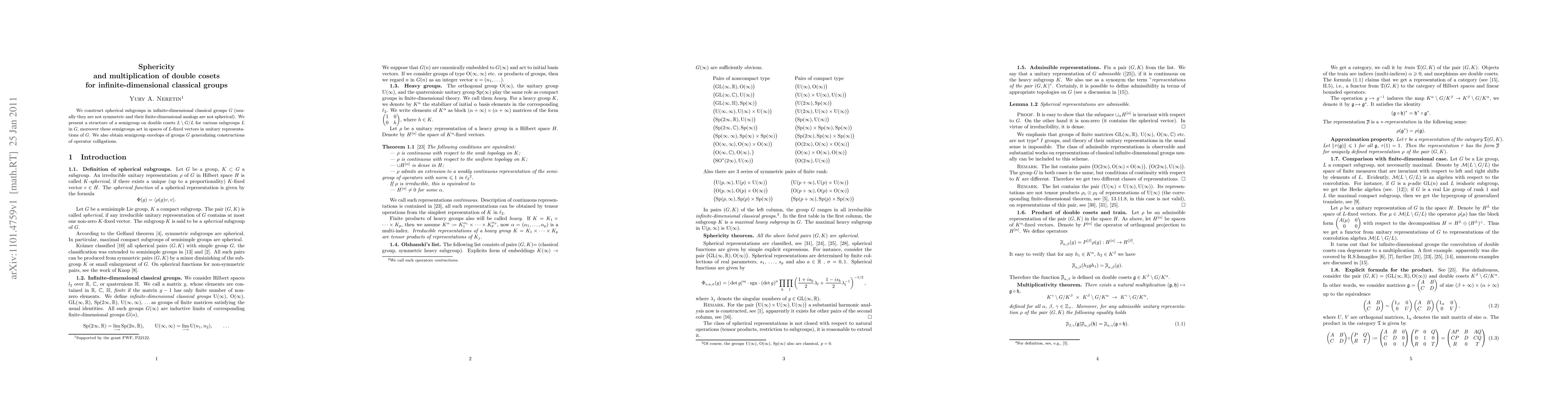 This paper constructs spherical subgroups in infinite-dimensional classical groups and introduces semigroups on double cosets that act on spaces of fixed vectors in unitary representations.