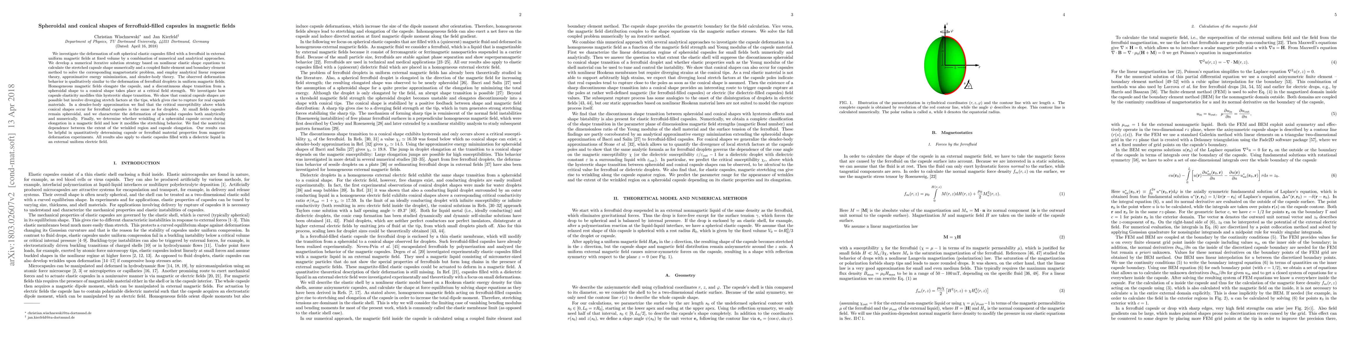 This paper investigates the deformation of elastic ferrofluid-filled capsules under uniform magnetic fields, using numerical and analytical methods. It finds that the magnetic field induces a shape transition from spheroidal to conical, with the critical field strength dependent on the capsule's elasticity, and that conical shapes can lead to rupture due to high stretch factors.