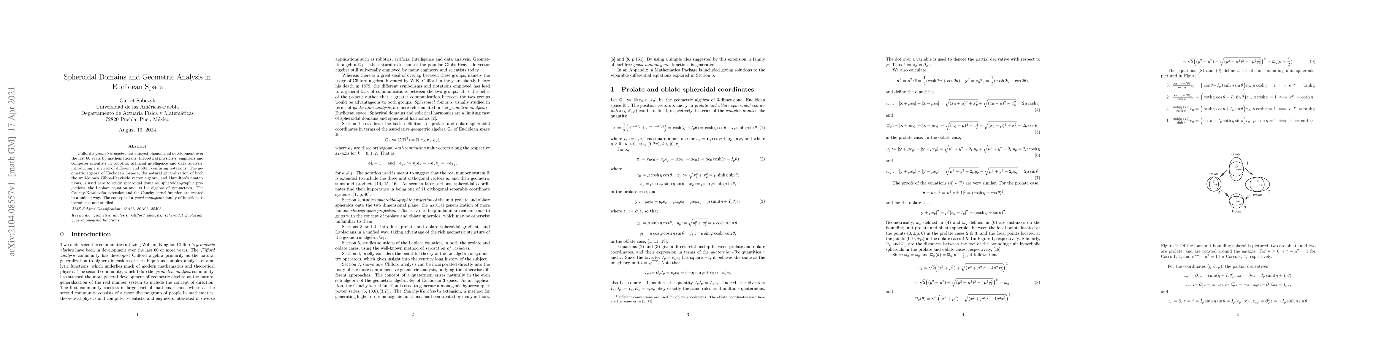 Clifford's geometric algebra has enjoyed phenomenal development over the last 60 years by mathematicians, theoretical physicists, engineers and computer scientists in robotics, artificial intelligence and data analysis, introducing a myriad of different and often confusing notations. The geometric algebra of Euclidean 3-space, the natural generalization of both the well-known Gibbs-Heaviside vector algebra, and Hamilton's quaternions, is used here to study spheroidal domains, spheroidal-graphic projections, the Laplace equation and its Lie algebra of symmetries. The Cauchy-Kovalevska extension and the Cauchy kernel function are treated in a unified way. The concept of a quasi-monogenic family of functions is introduced and studied.