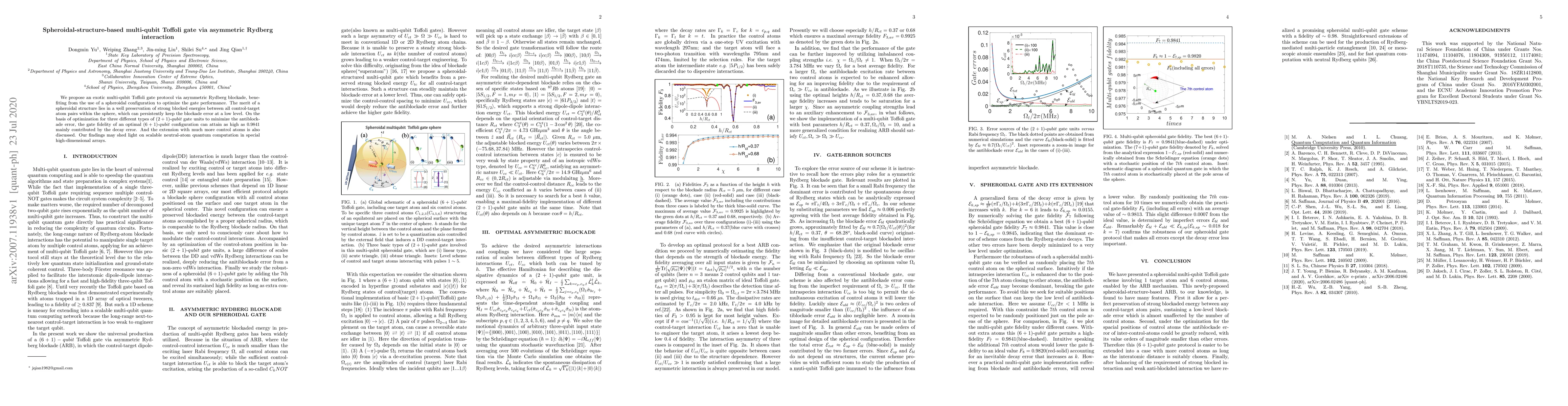 The paper proposes a novel multi-qubit Toffoli gate protocol using asymmetric Rydberg interaction within a spheroidal atomic configuration. This method maintains low blockade errors and high gate fidelity (0.9841) for a 7-qubit system, primarily due to decay errors. The research also explores scaling up with more control atoms, suggesting potential for scalable neutral-atom quantum computation in high-dimensional arrays.