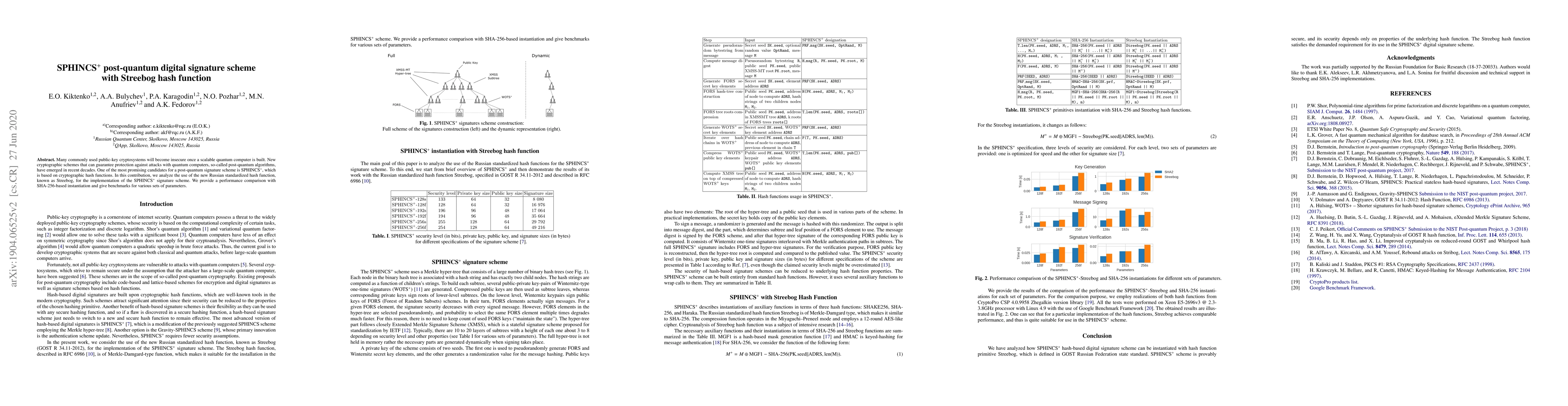 This paper explores the implementation of the SPHINCS$^+$ post-quantum digital signature scheme using the Russian hash function Streebog, comparing its performance and security against the SHA-256-based version, and providing benchmarks for different parameter sets.