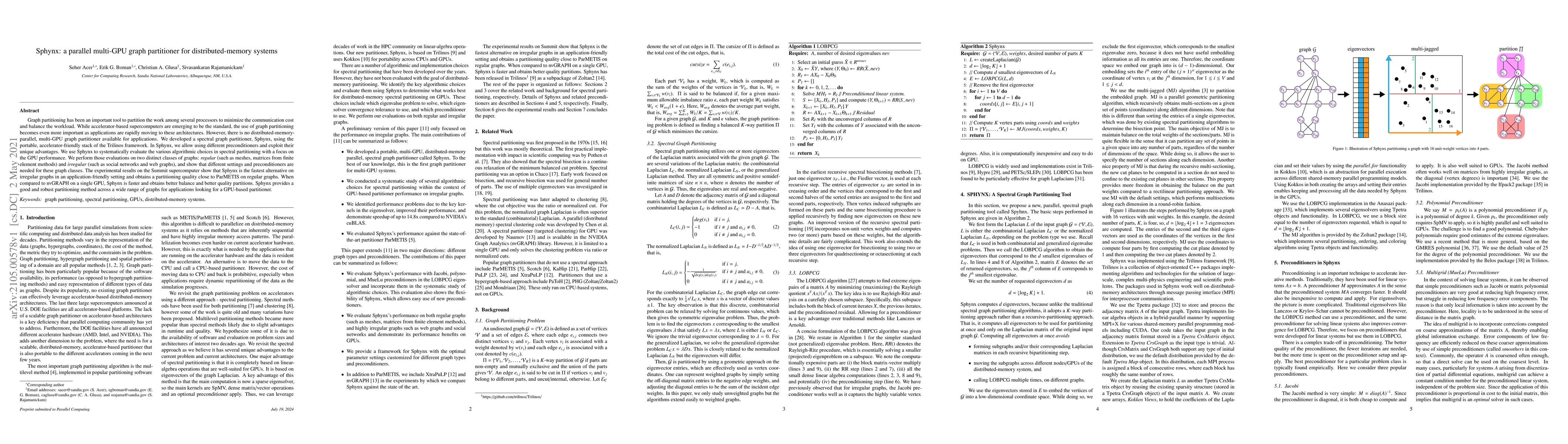 Sphynx is a parallel multi-GPU graph partitioner developed for distributed-memory systems to minimize communication costs and balance workload across processors. It outperforms other methods on both regular and irregular graphs, providing robust partitioning quality and performance on the Summit supercomputer.