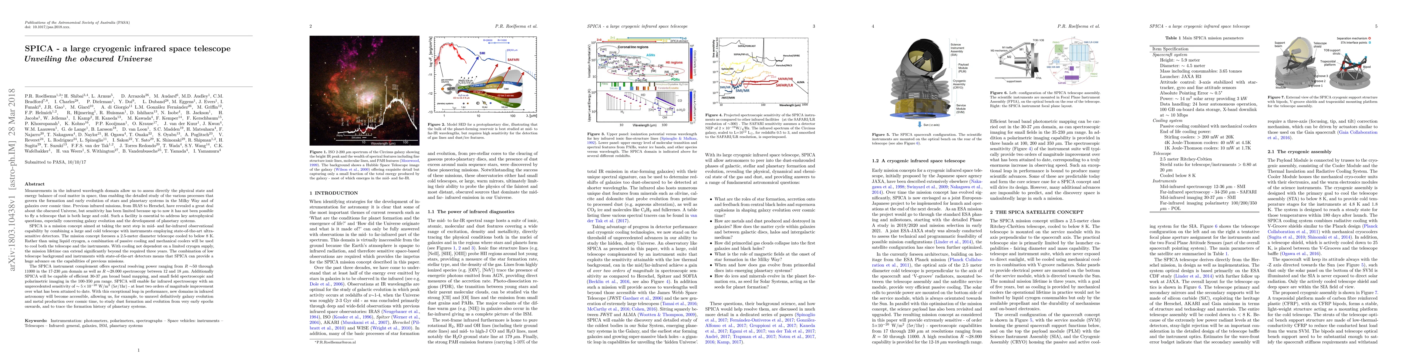 SPICA is a proposed cryogenic infrared space telescope with a 2.5-meter diameter cooled to below 8 K, aiming to significantly enhance mid- and far-infrared observational capabilities. It promises unprecedented spectroscopic sensitivity, enabling detailed studies of galaxy evolution, dust formation, and planetary system formation.