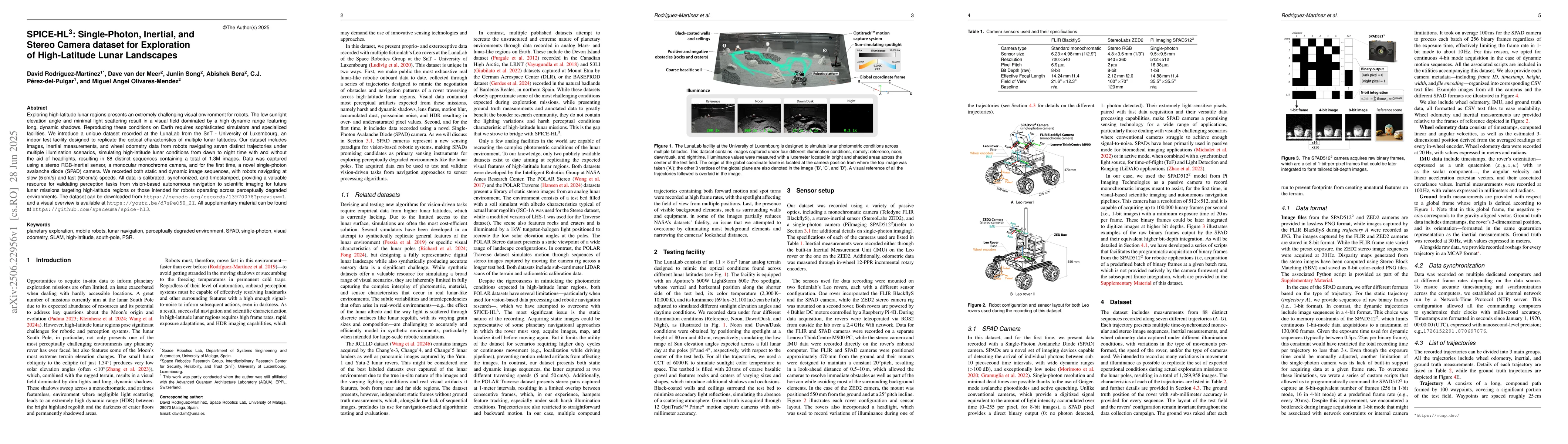 Exploring high-latitude lunar regions presents an extremely challenging visual environment for robots. The low sunlight elevation angle and minimal light scattering result in a visual field dominated by a high dynamic range featuring long, dynamic shadows. Reproducing these conditions on Earth requires sophisticated simulators and specialized facilities. We introduce a unique dataset recorded at the LunaLab from the SnT - University of Luxembourg, an indoor test facility designed to replicate the optical characteristics of multiple lunar latitudes. Our dataset includes images, inertial measurements, and wheel odometry data from robots navigating seven distinct trajectories under multiple illumination scenarios, simulating high-latitude lunar conditions from dawn to night time with and without the aid of headlights, resulting in 88 distinct sequences containing a total of 1.3M images. Data was captured using a stereo RGB-inertial sensor, a monocular monochrome camera, and for the first time, a novel single-photon avalanche diode (SPAD) camera. We recorded both static and dynamic image sequences, with robots navigating at slow (5 cm/s) and fast (50 cm/s) speeds. All data is calibrated, synchronized, and timestamped, providing a valuable resource for validating perception tasks from vision-based autonomous navigation to scientific imaging for future lunar missions targeting high-latitude regions or those intended for robots operating across perceptually degraded environments. The dataset can be downloaded from https://zenodo.org/records/13970078?preview=1, and a visual overview is available at https://youtu.be/d7sPeO50_2I. All supplementary material can be found at https://github.com/spaceuma/spice-hl3.