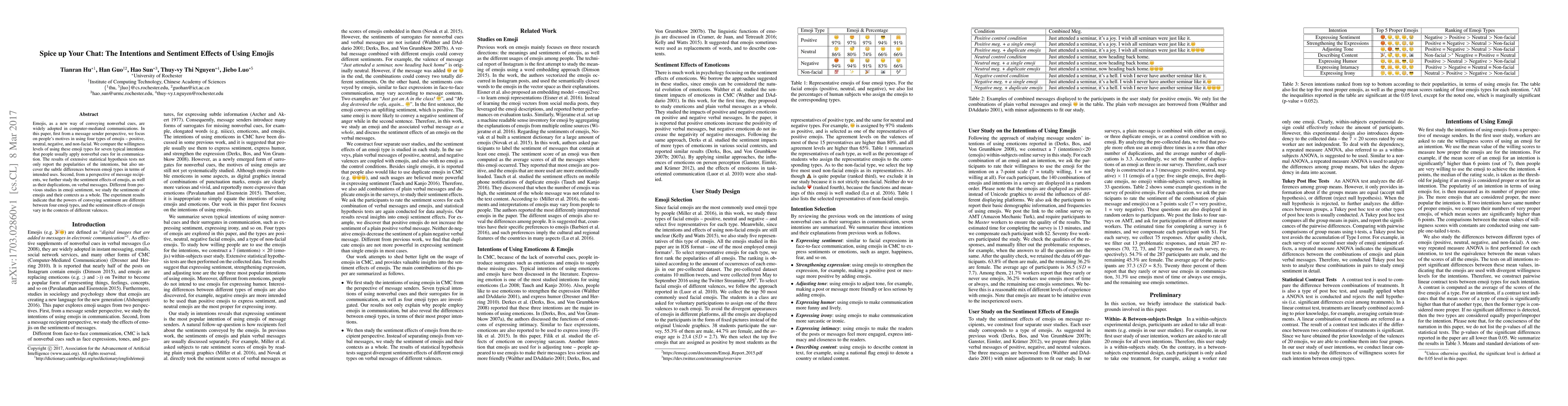 Emojis, as a new way of conveying nonverbal cues, are widely adopted in computer-mediated communications. In this paper, first from a message sender perspective, we focus on people's motives in using four types of emojis -- positive, neutral, negative, and non-facial. We compare the willingness levels of using these emoji types for seven typical intentions that people usually apply nonverbal cues for in communication. The results of extensive statistical hypothesis tests not only report the popularities of the intentions, but also uncover the subtle differences between emoji types in terms of intended uses. Second, from a perspective of message recipients, we further study the sentiment effects of emojis, as well as their duplications, on verbal messages. Different from previous studies in emoji sentiment, we study the sentiments of emojis and their contexts as a whole. The experiment results indicate that the powers of conveying sentiment are different between four emoji types, and the sentiment effects of emojis vary in the contexts of different valences.