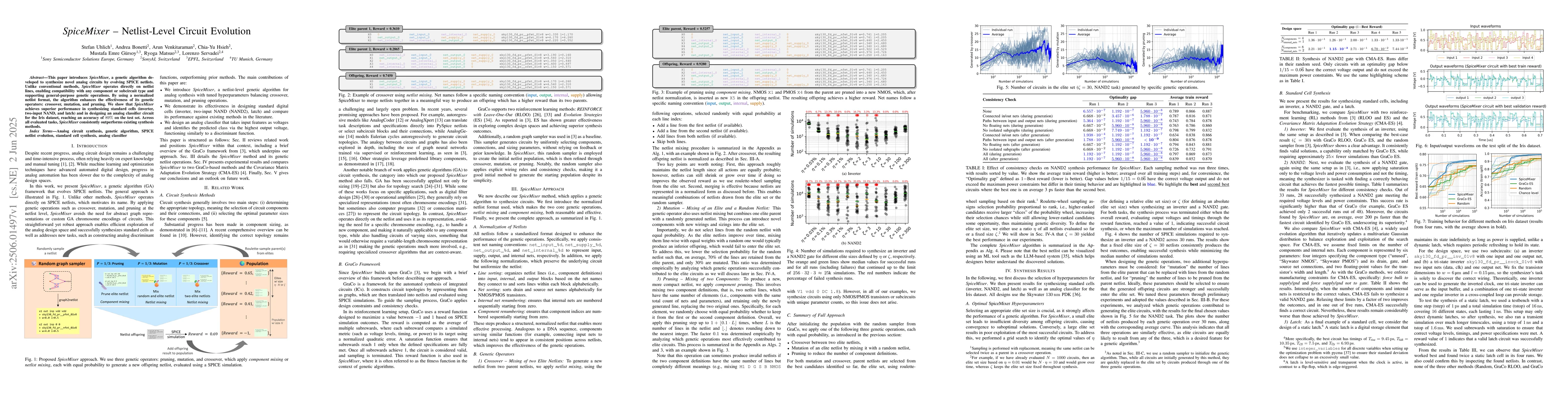 This paper introduces SpiceMixer, a genetic algorithm that evolves analog circuit designs from SPICE netlists, achieving superior performance in synthesizing various circuits and outperforming existing methods with an accuracy of 89% on the Iris dataset.
