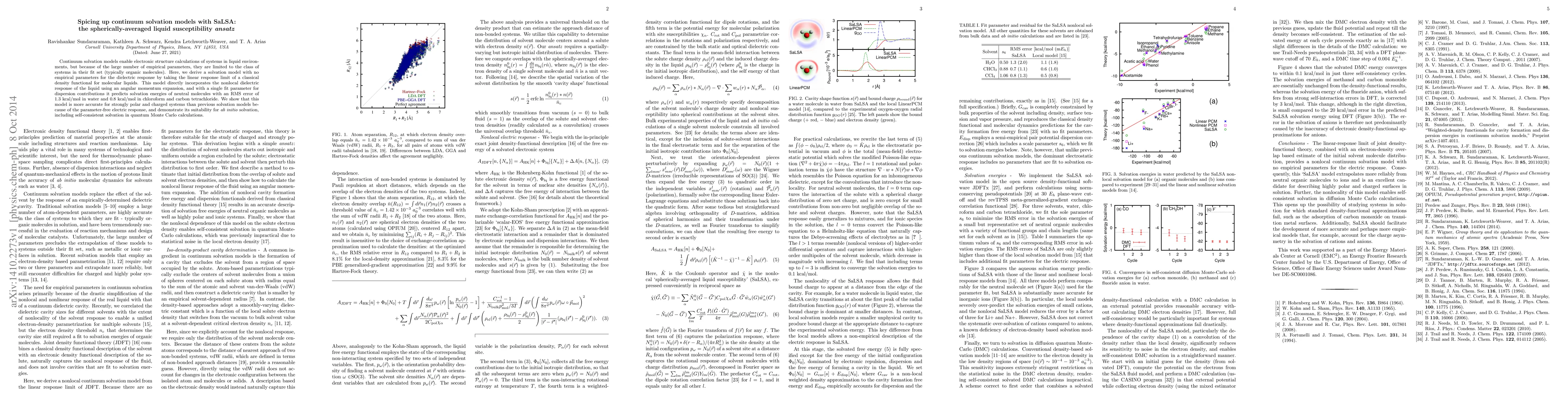 This paper introduces a parameter-free continuum solvation model using the SaLSA approach, which accurately predicts solvation energies for neutral molecules in various solvents with minimal RMS errors. The model's success is attributed to its incorporation of nonlocal dielectric response and a single dispersion parameter.