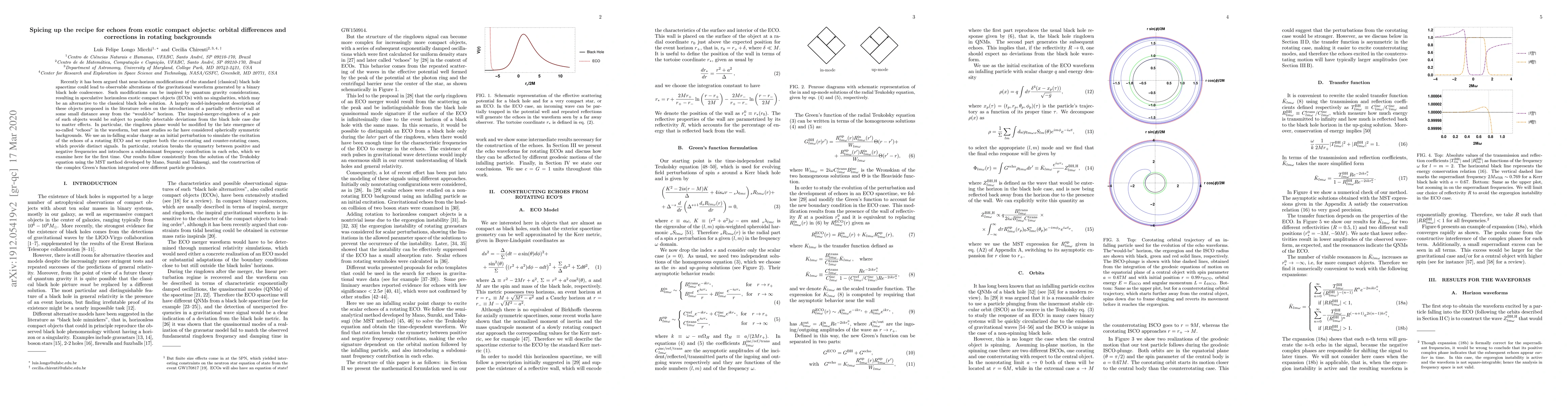 Recently it has been argued that near-horizon modifications of the standard (classical) black hole spacetime could lead to observable alterations of the gravitational waveform generated by a binary black hole coalescence. Such modifications can be inspired by quantum gravity considerations, resulting in speculative horizonless exotic compact objects (ECOs) with no singularities, which may be an alternative to the classical black hole solution. A largely model-independent description of these objects proposed in the literature relies on the introduction of a partially reflective wall at some small distance away from the "would-be" horizon. The inspiral-merger-ringdown of a pair of such objects would be subject to possibly detectable deviations from the black hole case due to matter effects. In particular, the ringdown phase would be modified by the late emergence of so-called "echoes" in the waveform, but most studies so far have considered spherically symmetric backgrounds. We use an in-falling scalar charge as an initial perturbation to simulate the excitation of the echoes of a rotating ECO and we explore both the co-rotating and counter-rotating cases, which provide distinct signals. In particular, rotation breaks the symmetry between positive and negative frequencies and introduces a subdominant frequency contribution in each echo, which we examine here for the first time. Our results follow consistently from the solution of the Teukolsky equation using the MST method developed by Mano, Suzuki and Takasugi, and the construction of the complex Green's function integrated over different particle geodesics.