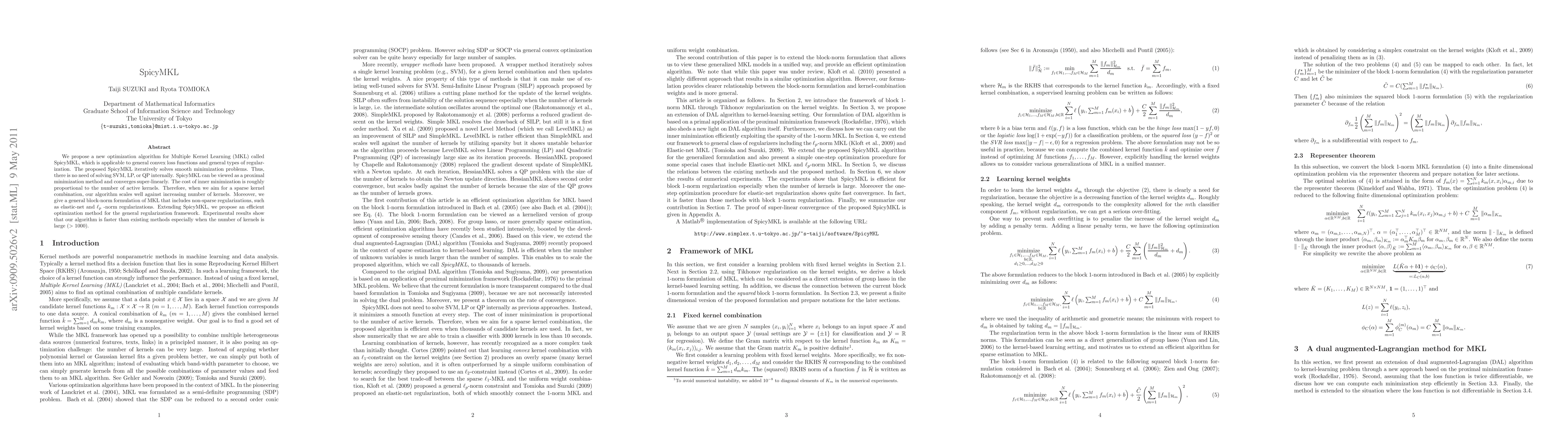 We propose a new optimization algorithm for Multiple Kernel Learning (MKL) called SpicyMKL, which is applicable to general convex loss functions and general types of regularization. The proposed SpicyMKL iteratively solves smooth minimization problems. Thus, there is no need of solving SVM, LP, or QP internally. SpicyMKL can be viewed as a proximal minimization method and converges super-linearly. The cost of inner minimization is roughly proportional to the number of active kernels. Therefore, when we aim for a sparse kernel combination, our algorithm scales well against increasing number of kernels. Moreover, we give a general block-norm formulation of MKL that includes non-sparse regularizations, such as elastic-net and \ellp -norm regularizations. Extending SpicyMKL, we propose an efficient optimization method for the general regularization framework. Experimental results show that our algorithm is faster than existing methods especially when the number of kernels is large (> 1000).