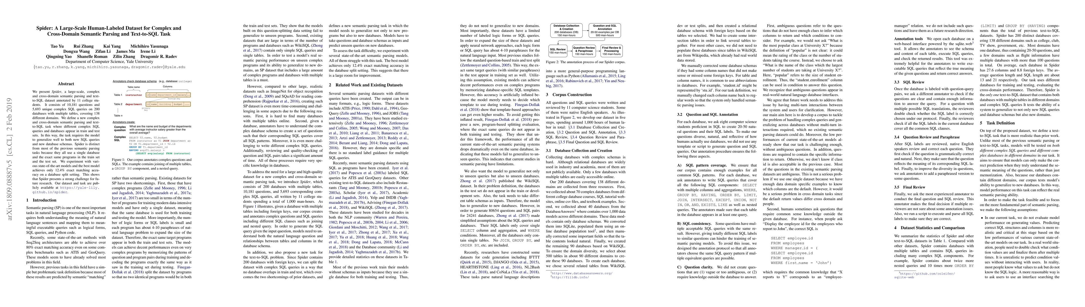 Spider is a large-scale, human-labeled dataset for complex and cross-domain semantic parsing and text-to-SQL tasks, featuring 10,181 questions and 5,693 unique SQL queries across 200 diverse databases. Despite state-of-the-art models achieving just 12.4% accuracy, it poses a significant challenge for future research due to its requirement for generalization to new SQL queries and database schemas.